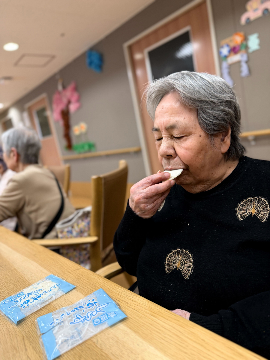 みんなでテーブルを囲みながら、「私は甘いものが好きでね」「昔はこんなおやつをよく食べていたのよ」と、それぞれの思い出や好みを語り合いました。かりんとうのやさしい甘さに「懐かしい味だね」と目を細める方もいれば、パリッとしたおせんべいの食感に思わず笑顔になる方もいました。