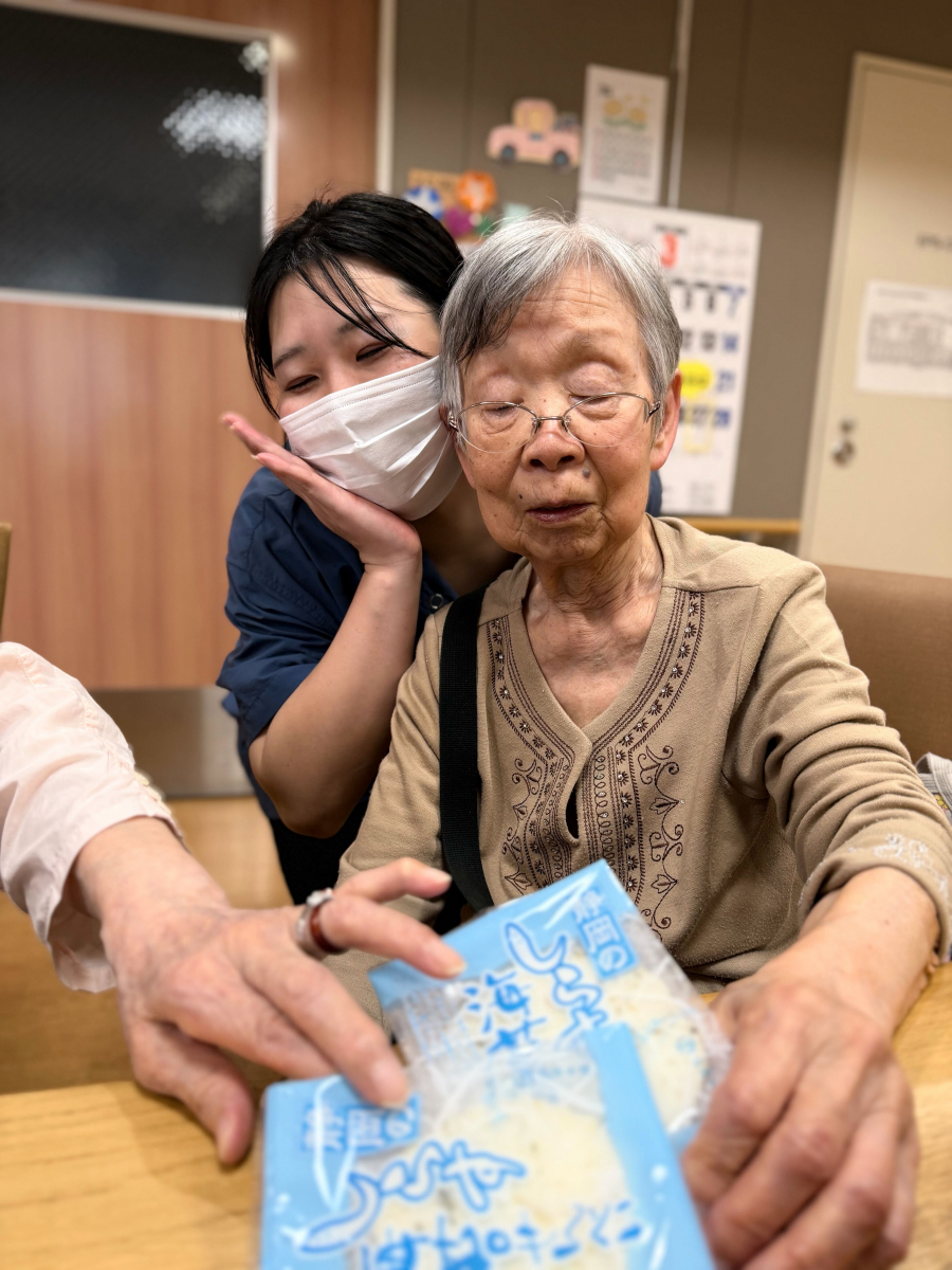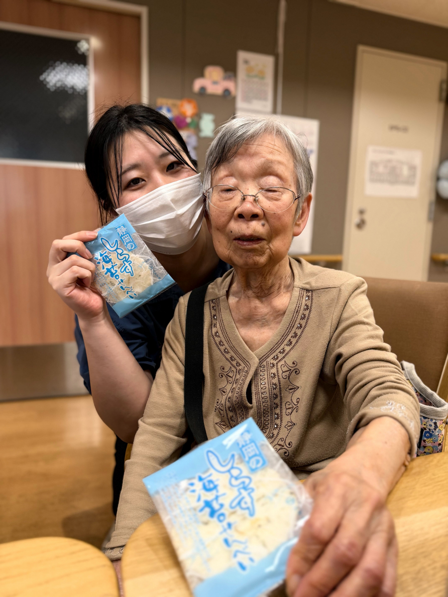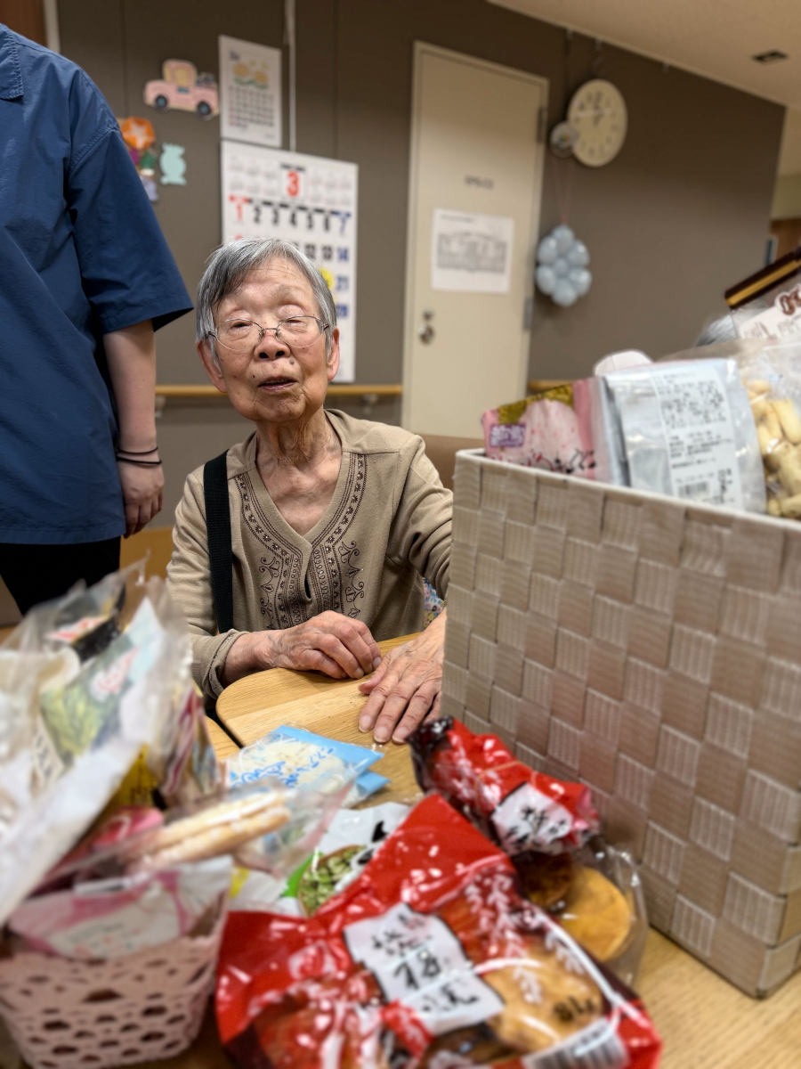 午後のやわらかな日差しが差し込む中、つばめの里では心温まるひとときが広がっていました。その中心にいたのは、いつも優しく微笑む利用者の一人、イ様です。この日、イ様は「みんなにぜひ食べてもらいたいものがあるの」と、静岡から取り寄せたおせんべいや、昔懐かしいかりんとう、そして甘くてほっとするお菓子をたくさん用意してくださいました。