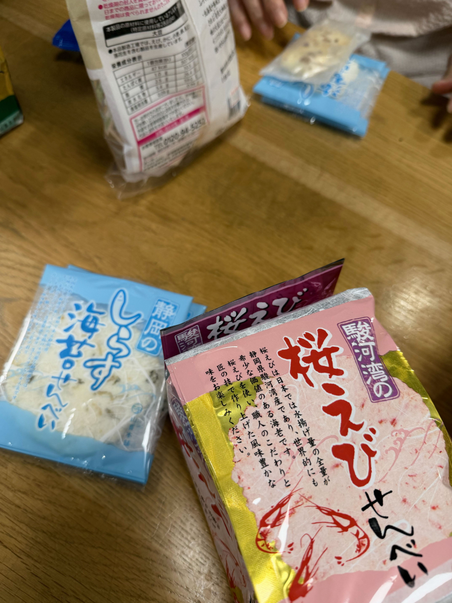 お盆いっぱいに並べられた色とりどりのお菓子は、それぞれに素朴でどこか懐かしい香りをまとっていて、見ているだけで自然と笑顔がこぼれます。袋を開けた瞬間に広がる香ばしいおせんべいの香りに、「わあ、いい匂い!」と声が上がり、場の空気は一気に和やかになりました。