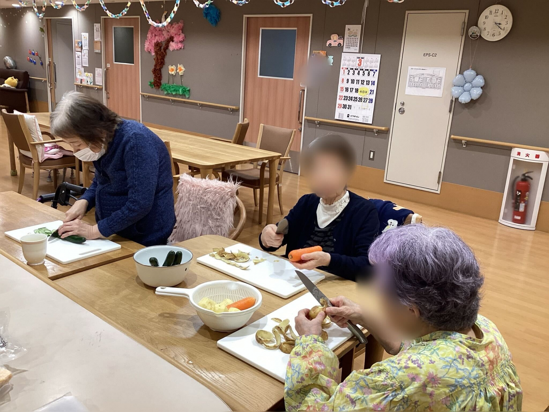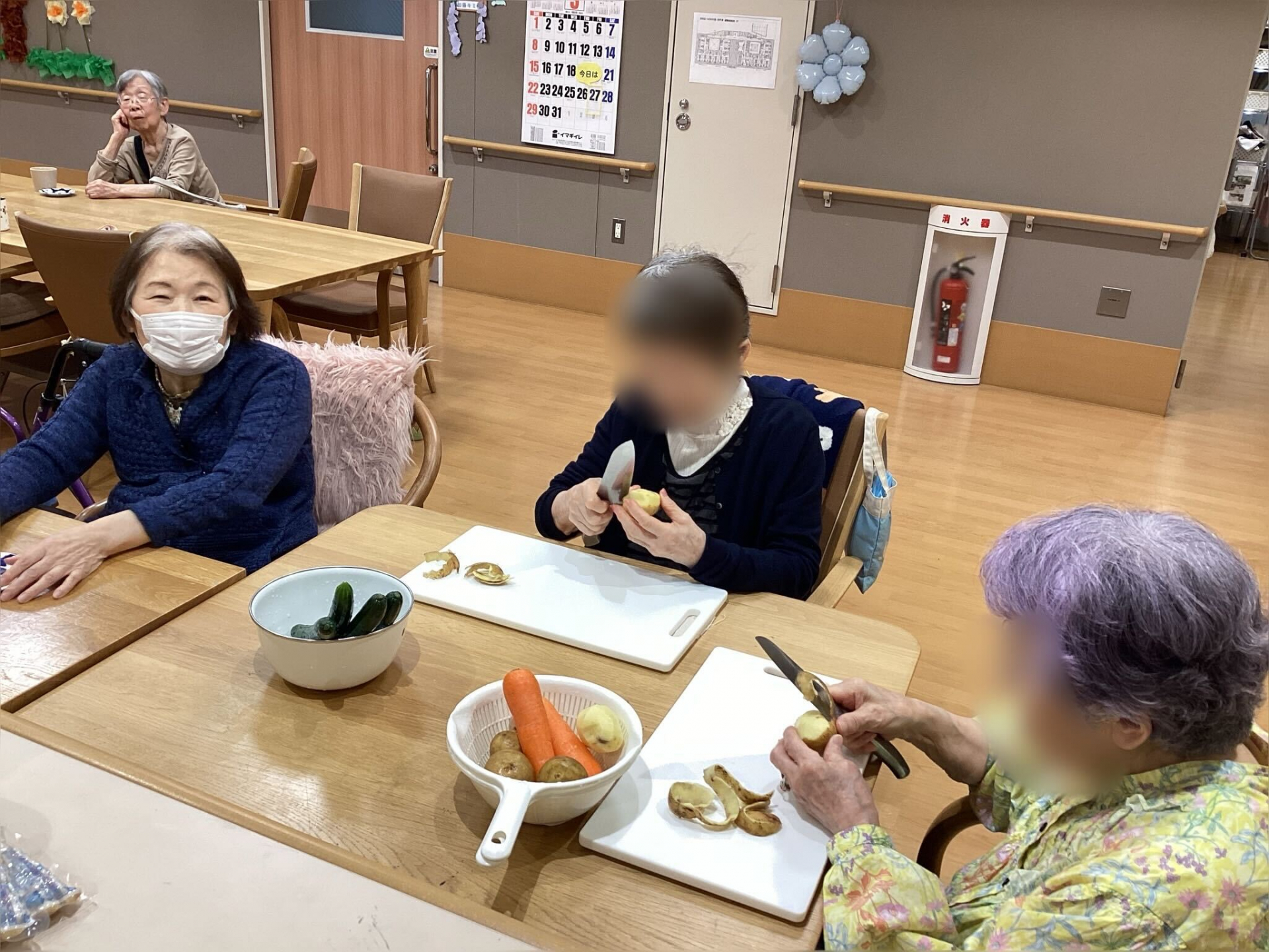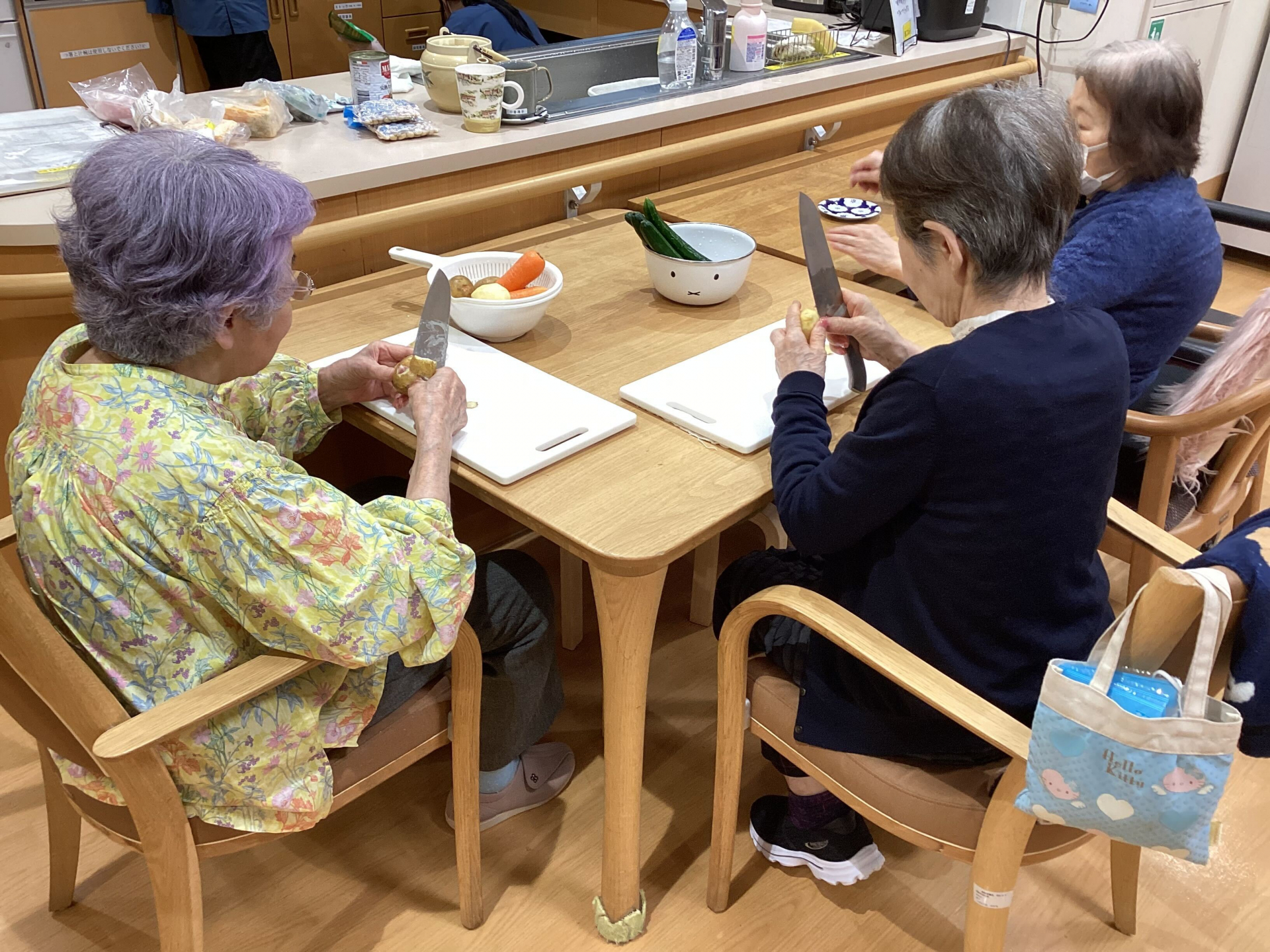 本日のメニューは、体も心も温まるポークビーンズ。テーブルにはじゃがいもやにんじんが並び、「どれを切ろうか」「皮むきなら任せて」と自然と役割分担が生まれていきます。包丁を手に、丁寧に野菜を切る方、ゆっくりと皮をむく方、それぞれのペースで作業が進んでいきました。