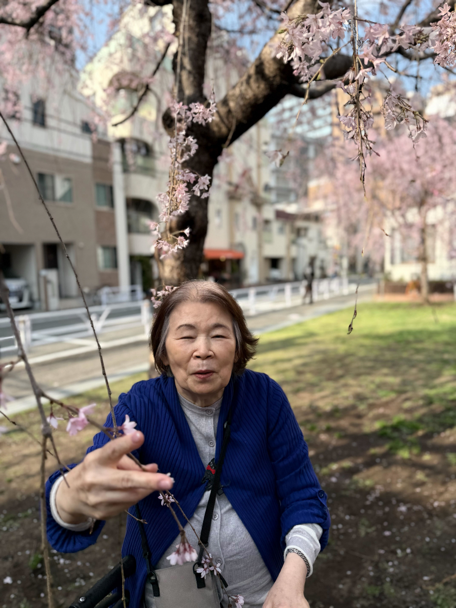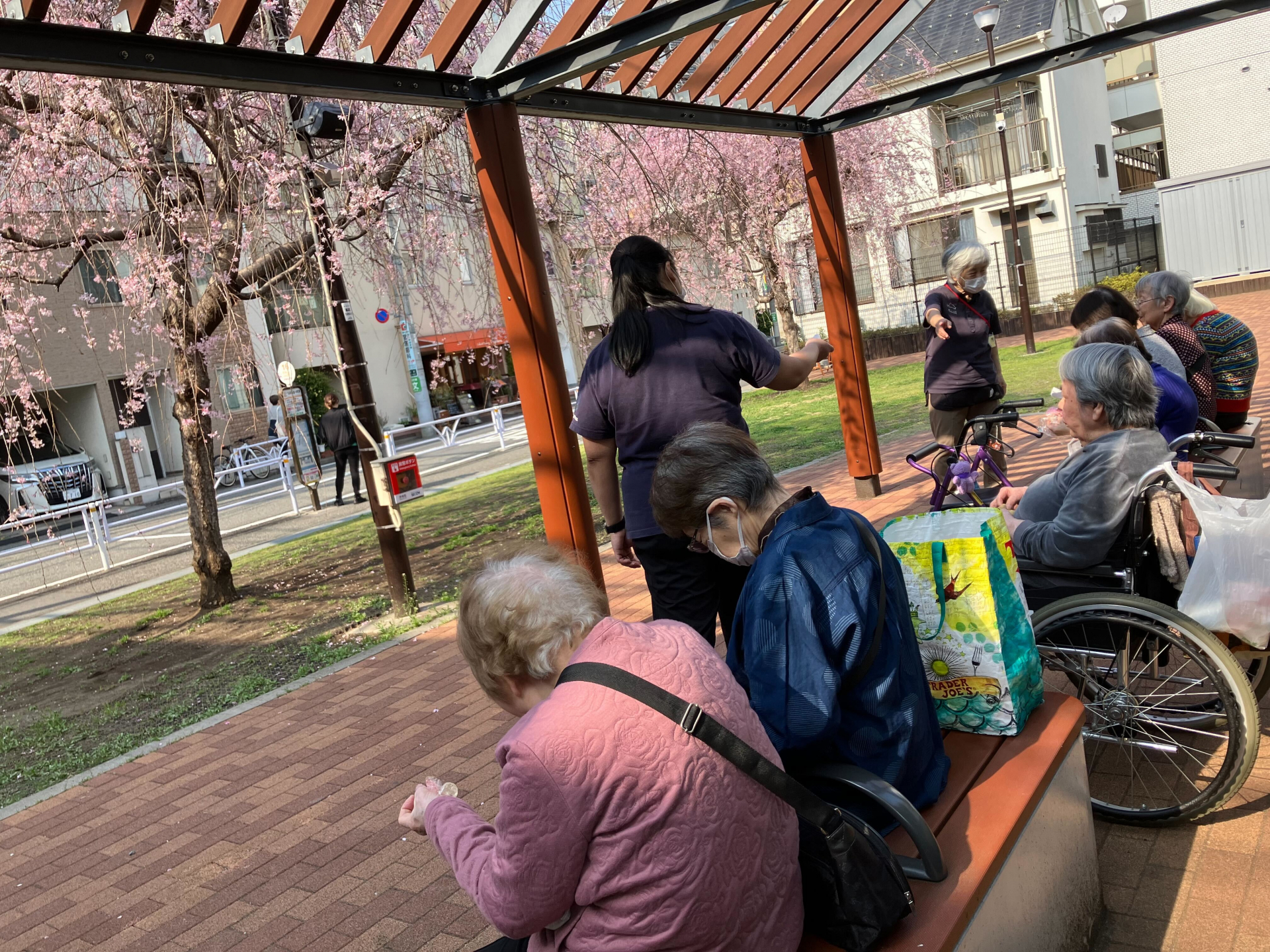 桜の下では、温かいお茶とともに、おはぎを召し上がっていただきました。「やっぱり外で食べると違うね」「春だねえ」といった言葉とともに、皆さまの表情も自然とやわらぎます。お一人おひとりのペースで、ゆっくりと味わうその姿がとても印象的でした。