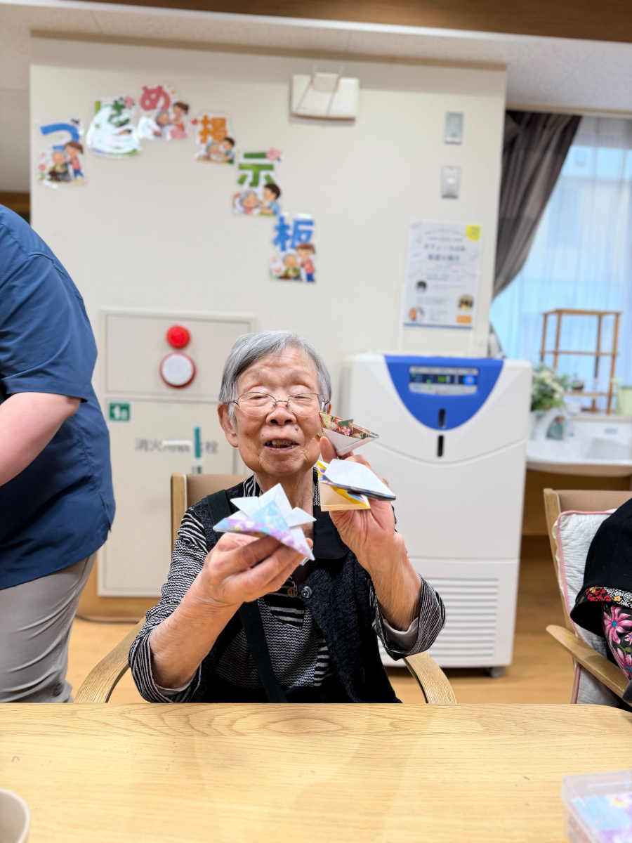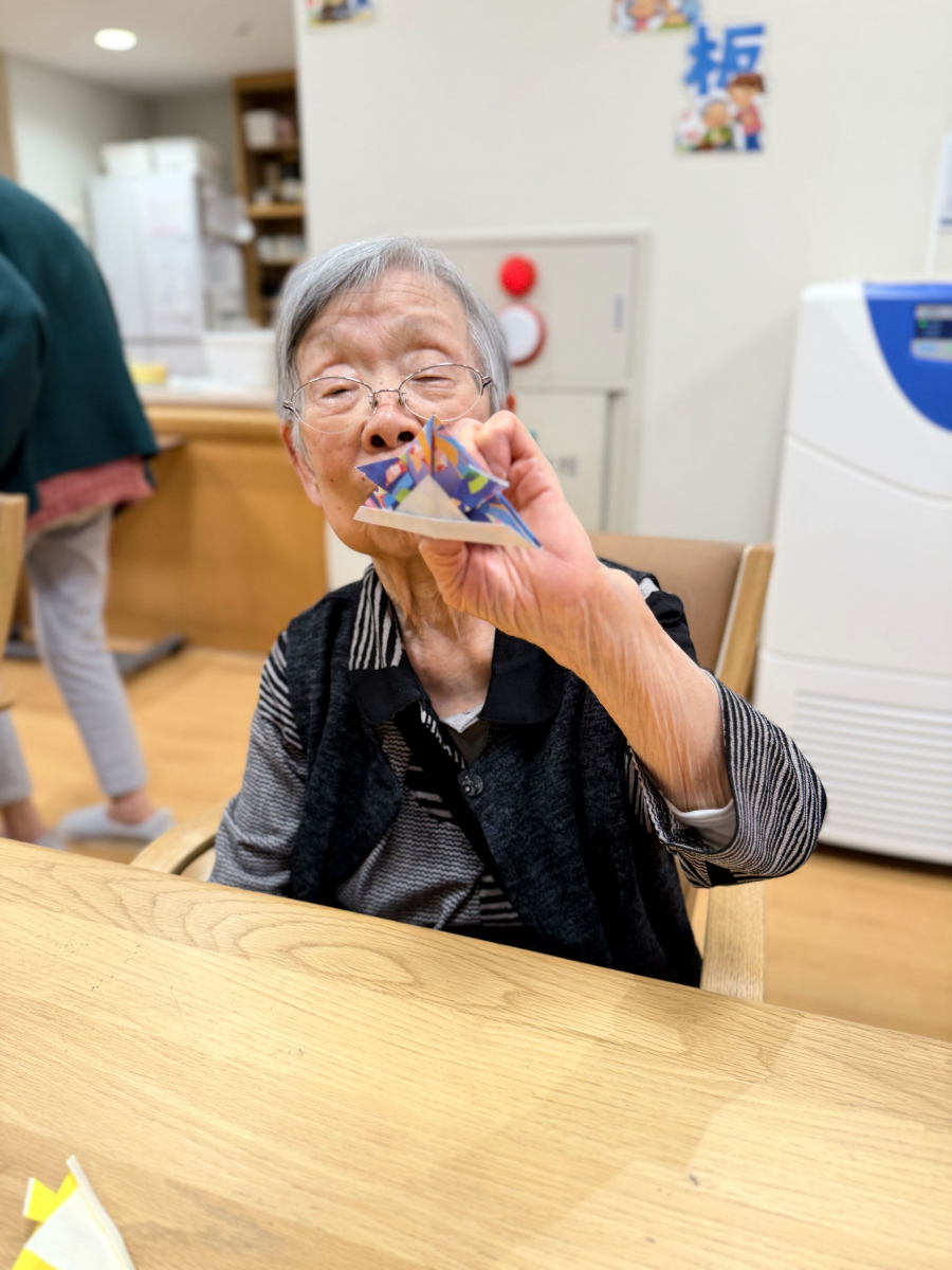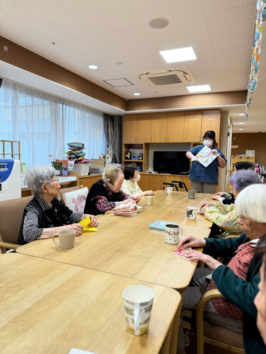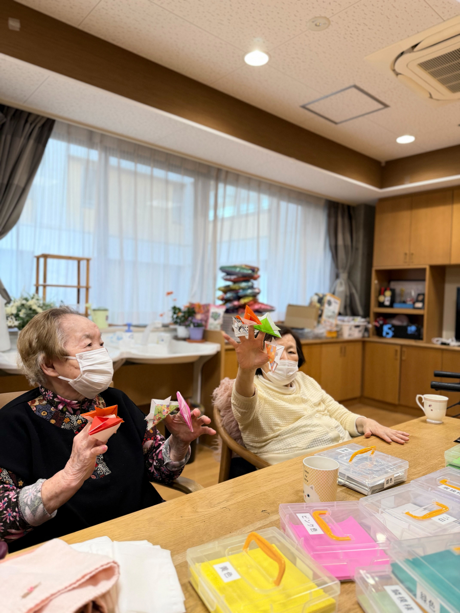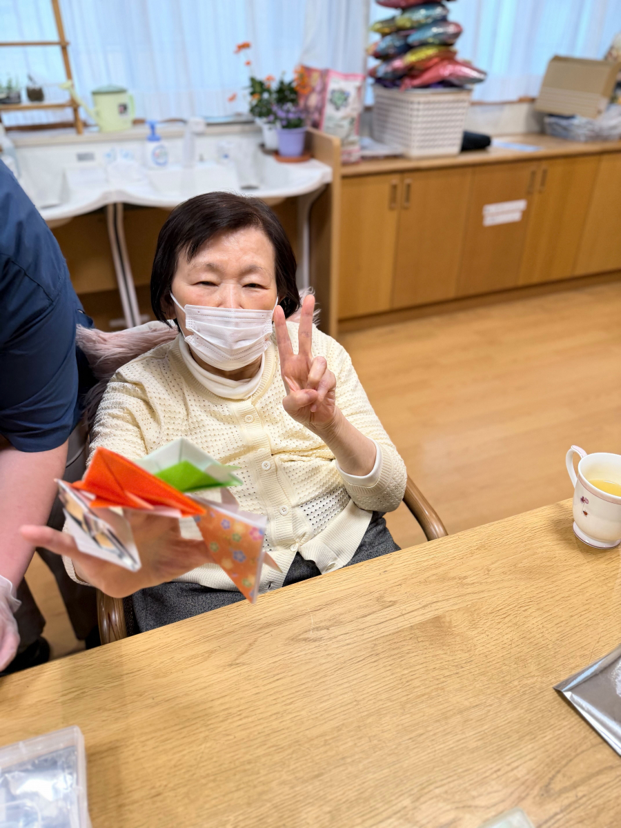 At the elderly group home Tsubame no Sato, we spent a wonderful and lively recreation time making kabuto (samurai helmets) for Kodomo no Hi using colorful origami paper.