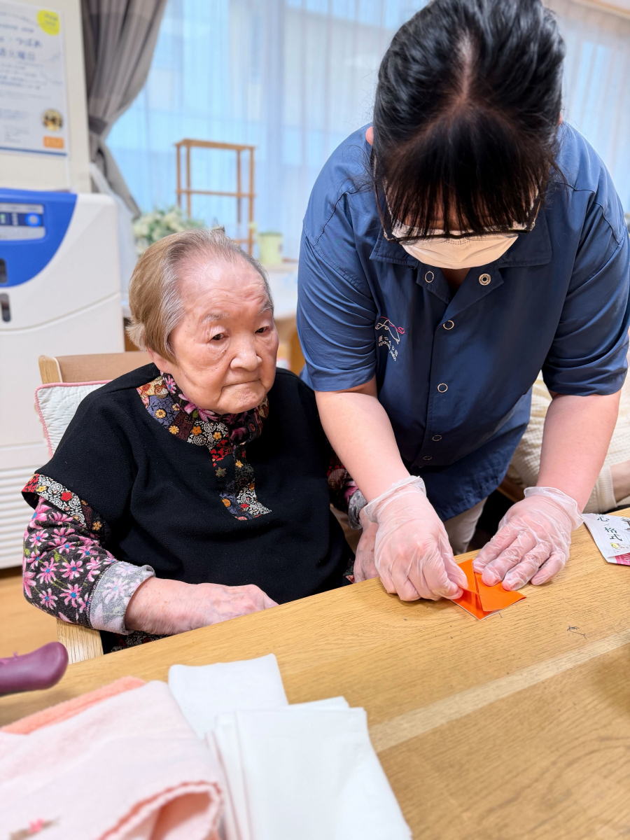 つばめの里のグループホームでは、レクリエーションの時間に、折り紙を使ってこどもの日のかぶと作りを楽しみました。