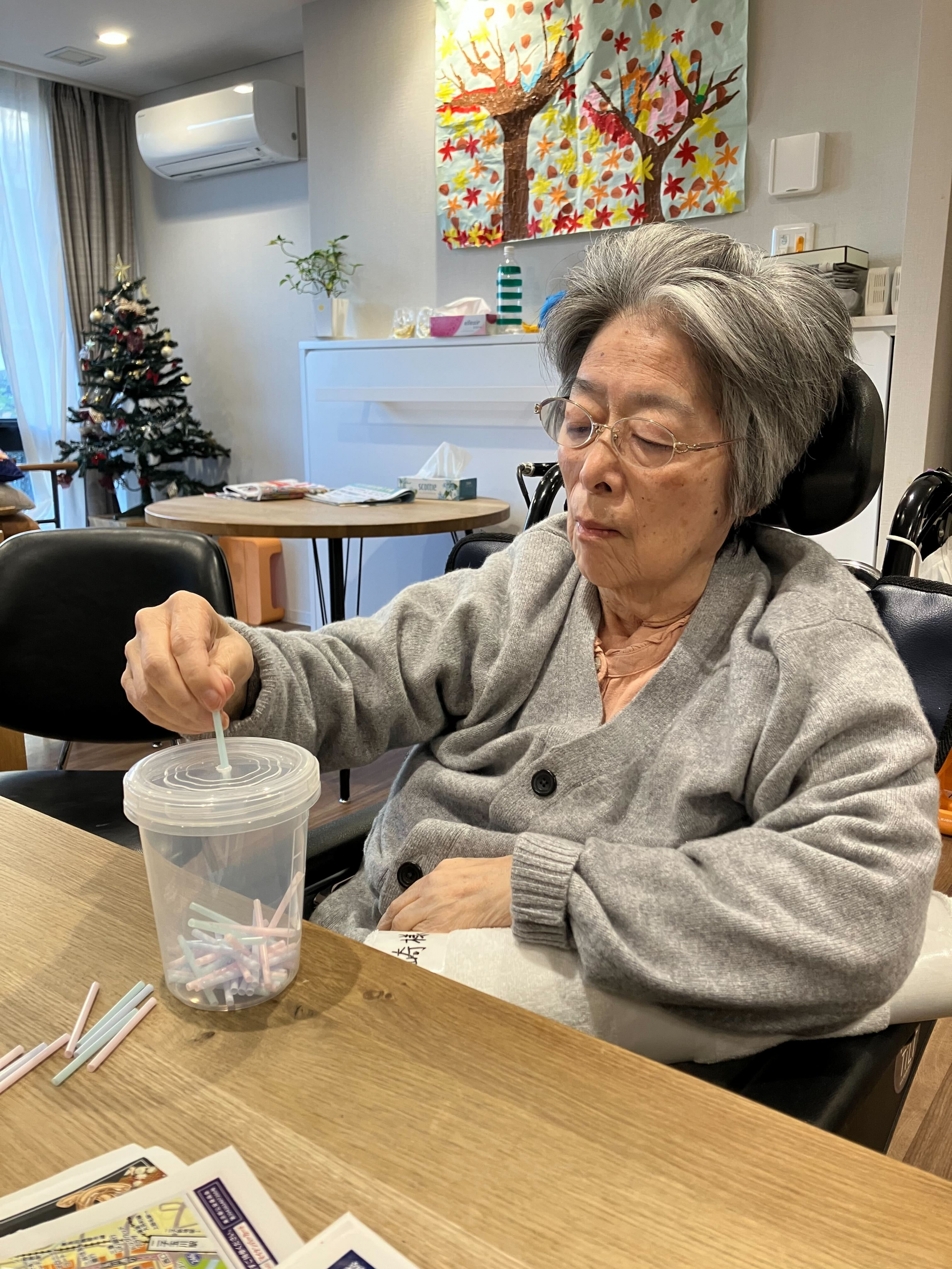 おやつ頂いた後にE様とコップの穴にストロー通すレクリエーションをやりました。q(≧▽≦q)