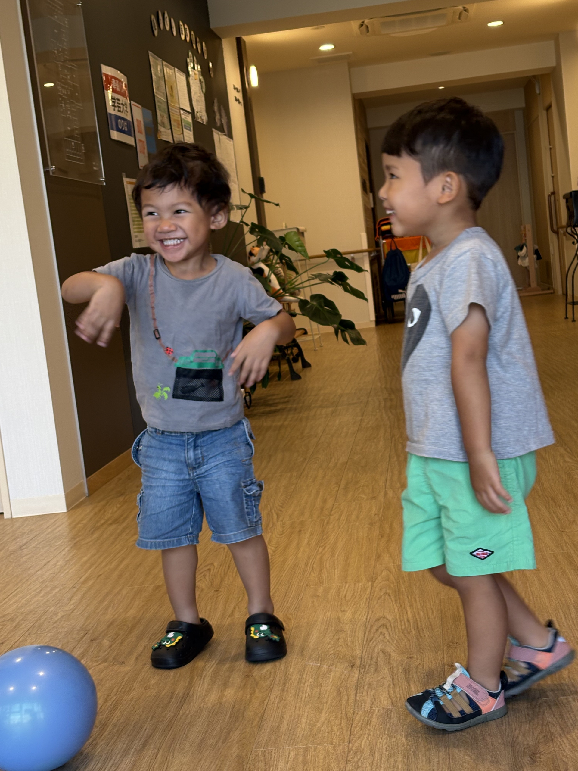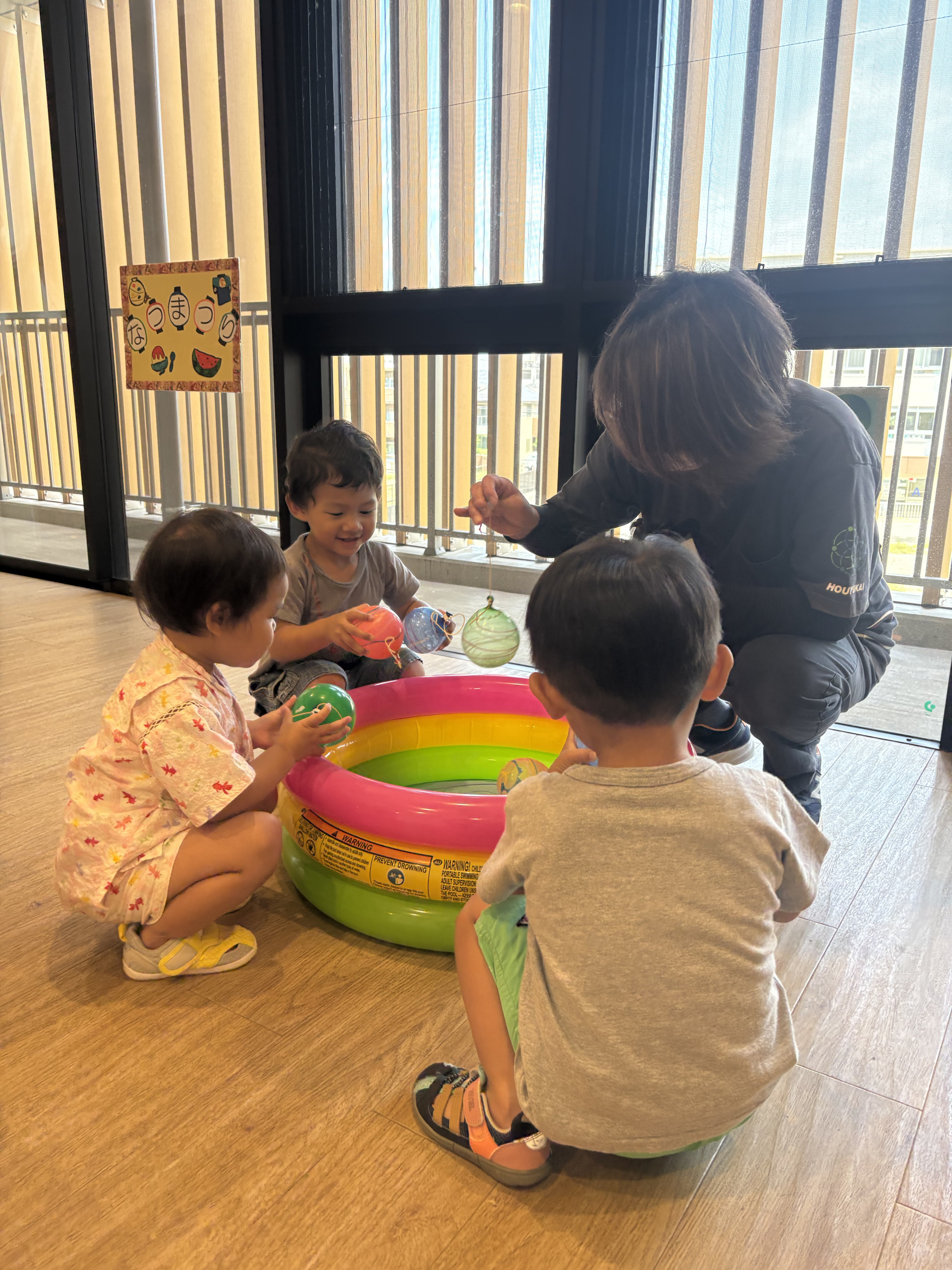 まず気になったのはヨーヨー釣り!気に入ったヨーヨーを保育者のやり方を見ながら真似してビヨンビヨンとバウンドさせてみたり、振って中の水が動く音を楽しんでいました!