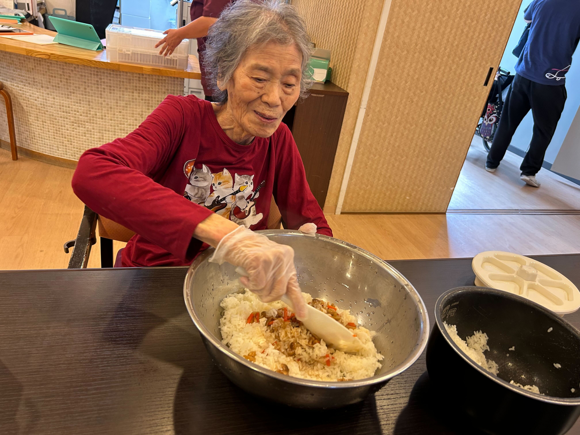 始めに、差し入れのしめじを使って混ぜご飯を作ろう♪