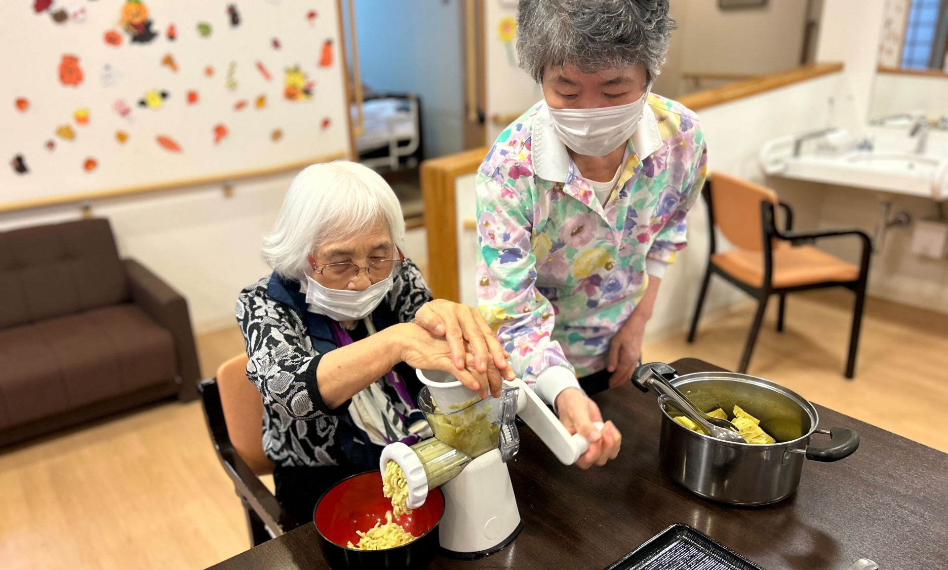 茹でたお芋を挽いてね、裏ごしより楽にできますよ
