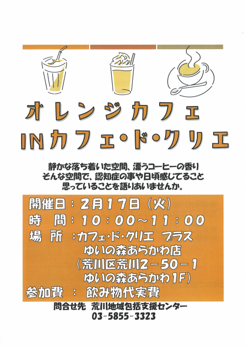 2026.02.05 【荒川包括】オレンジカフェINカフェ・ド・クリエを開催します お知らせ #オレンジカフェ #認知症 2026.01.14 【荒川包括】 あら茶&I茶会を開催しました 活動報告 #認知症 #あら茶会 # 回想法 2025.04.17 【荒川包括】あらかわ見守りシール交付事業をご存知ですか? お知らせ #認知症 2024.11.14 【荒川包括】あらにん会勉強会を行いました。 活動報告 #勉強会 #認知症 #あらにん会 2024.07.04 【荒川包括】令和6年7~9月のものわすれ相談のご案内 活動報告 #ものわすれ相談 #認知症