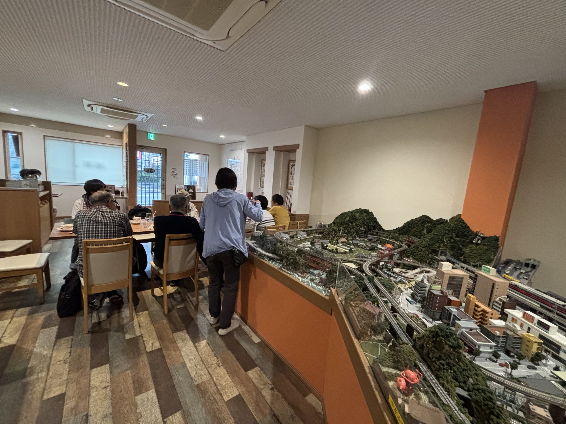 ↓こちらの喫茶店には手作りのジオラマがあり、会の後に電車を見せていただきました。