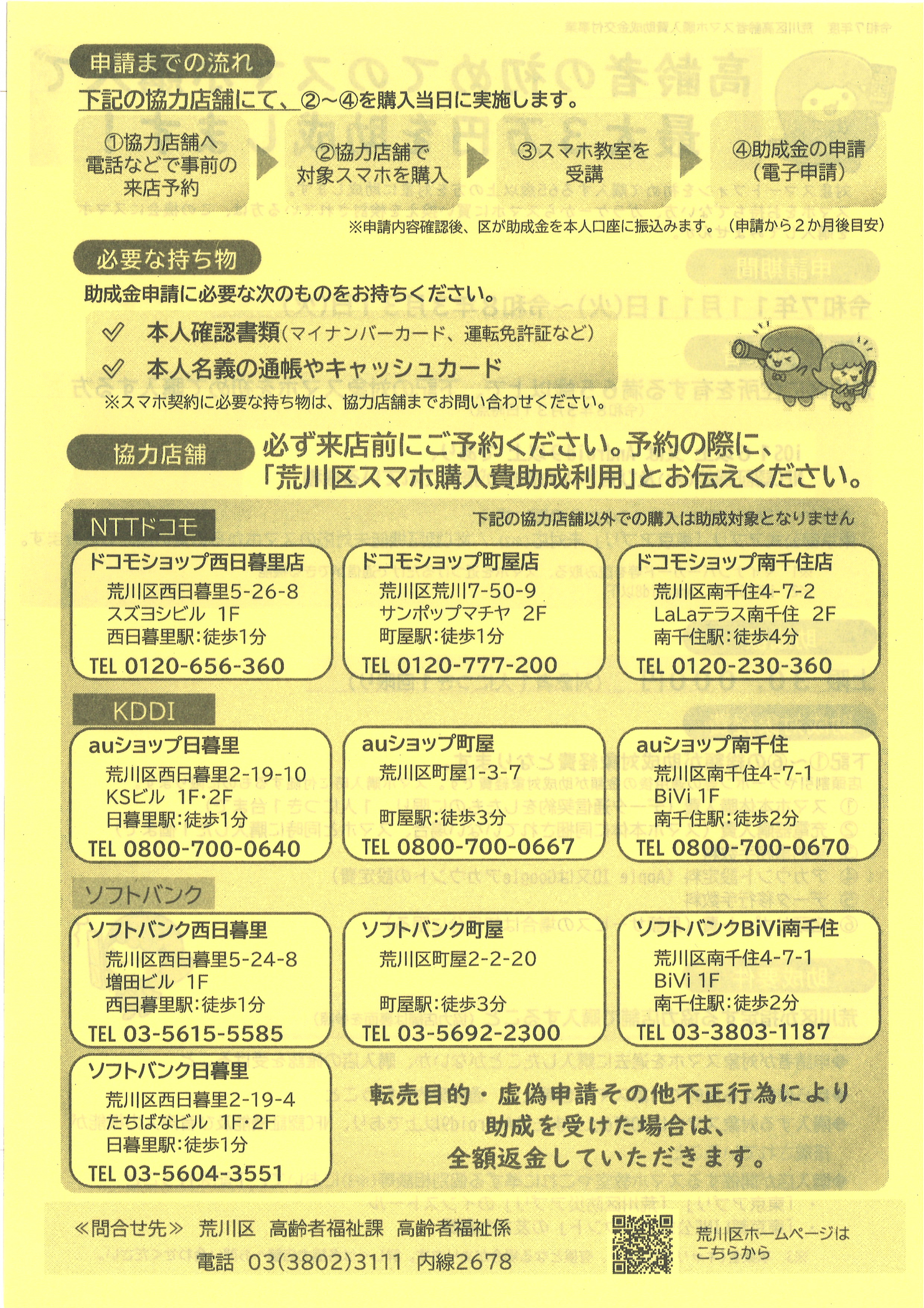 来店前には、必ずご予約をしていただき、予約の際に「荒川区スマホ購入費助成利用」とお伝えください。
