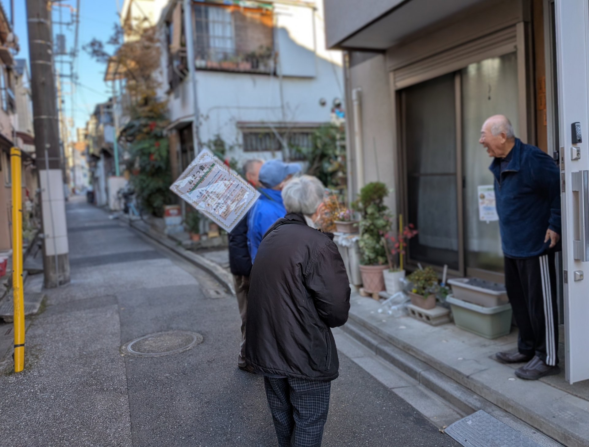 朝8時、ゆいの森あらかわで集合し、おせっ会の幟を背負い、近隣の高齢者に声掛けをして歩きます。