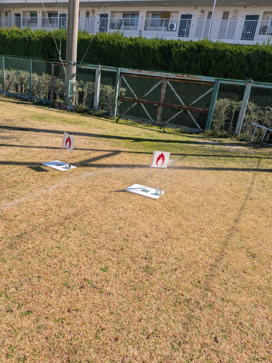 消火訓練として、実物の消化器(今回は中は水)を使用して、火に見立てた旗をめがけた消火訓練や、火災時と類似した煙体験ハウスの中に入る体験をしました。