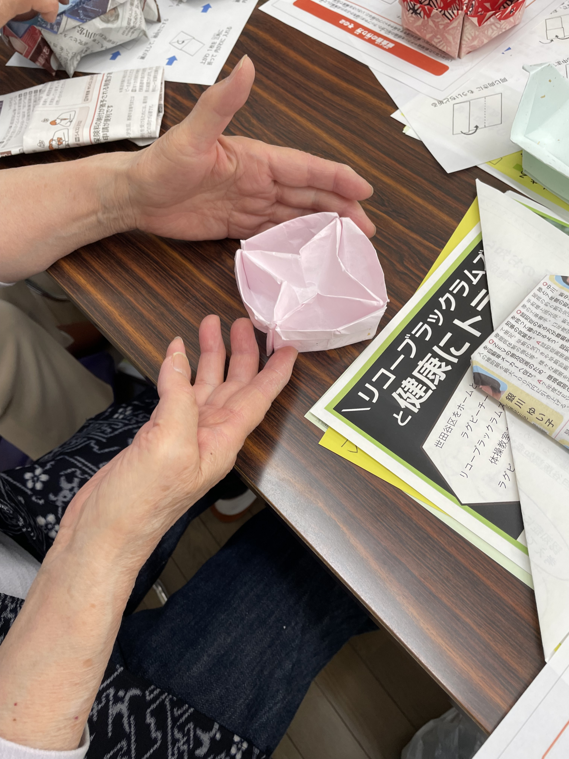 今回は皆さんで折り紙を楽しんだのですが、折り紙の他にも新聞紙で作る簡単なスリッパや広告で作る小物入れ等、身近なもので出来るものが沢山紹介されました♪