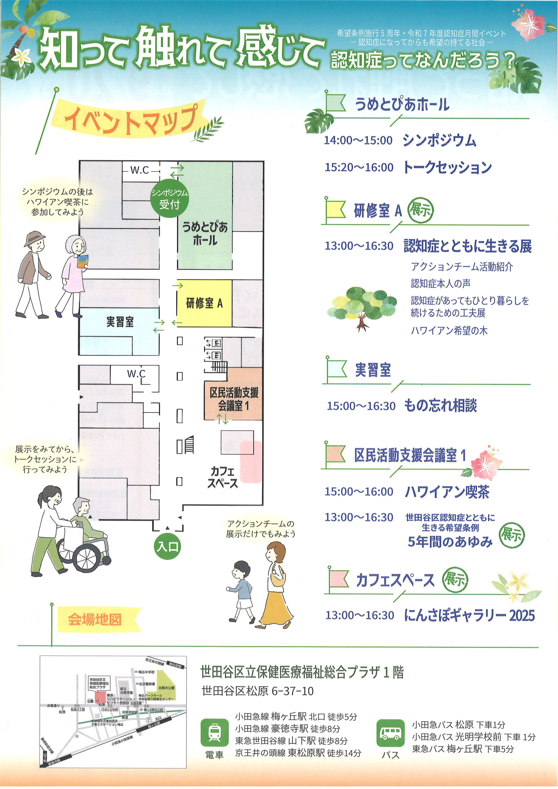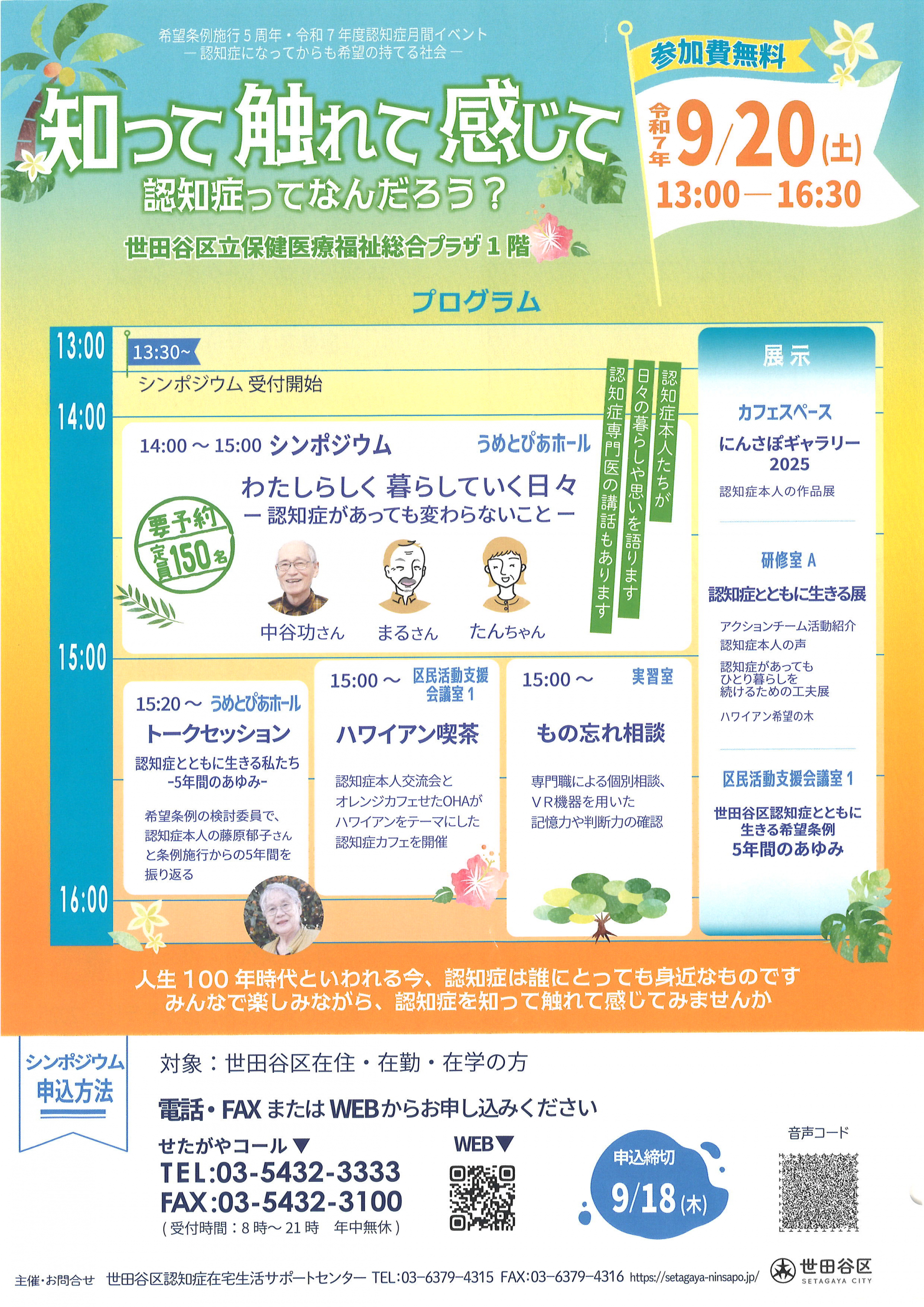 認知症になってからも希望の持てる社会を目指し、9月20日(土)に世田谷区立保険医療福祉総合プラザにてイベントが開催されます。