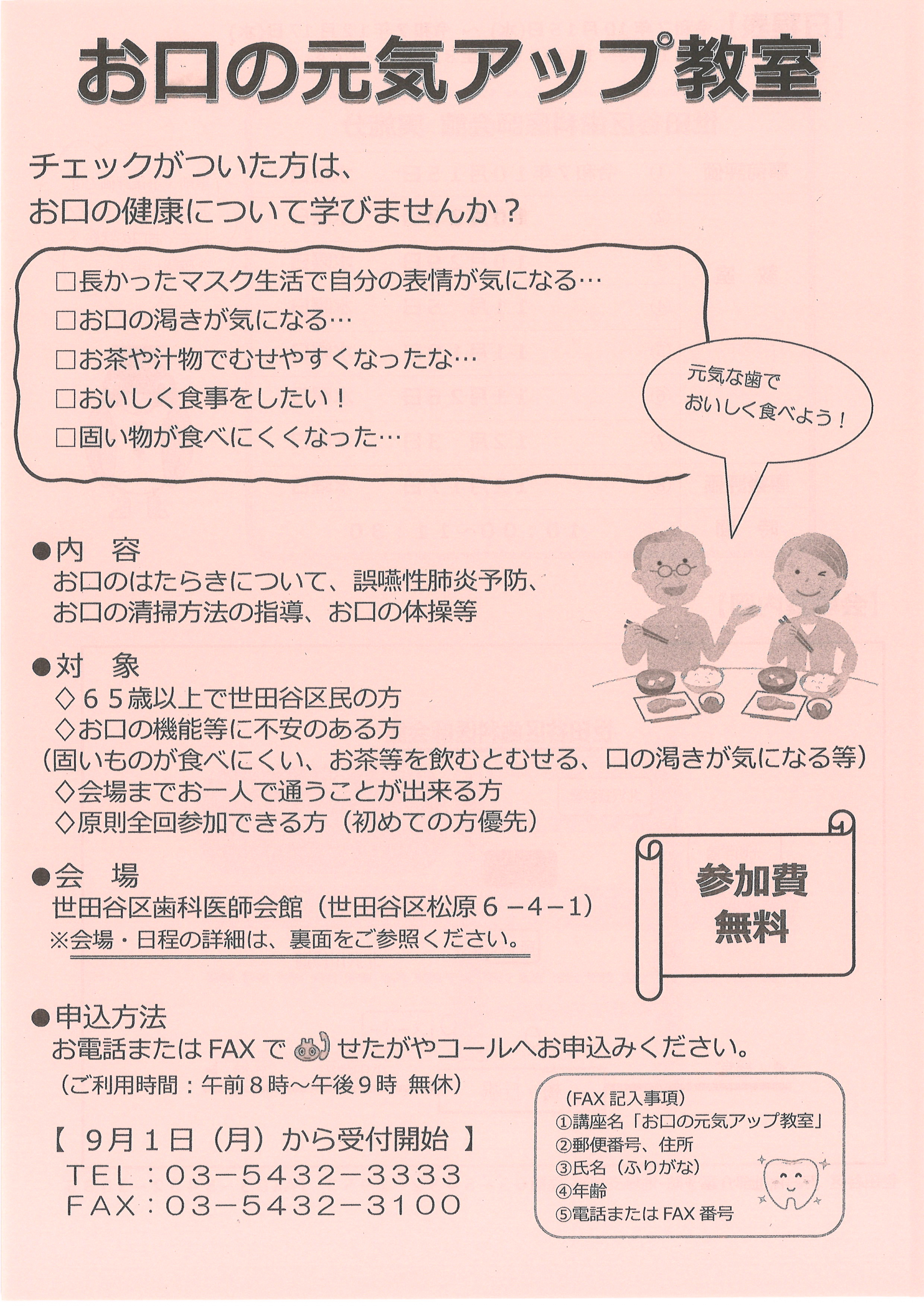 世田谷区では「お口の元気アップ教室」を開催しています。詳細は下記チラシをご確認ください。