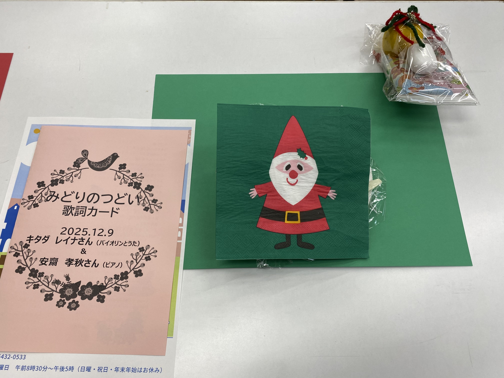 今回はクリスマスコンサートということで、バイオリンと歌、そしてピアノの演奏を参加者の皆さんと一緒に楽しみました。