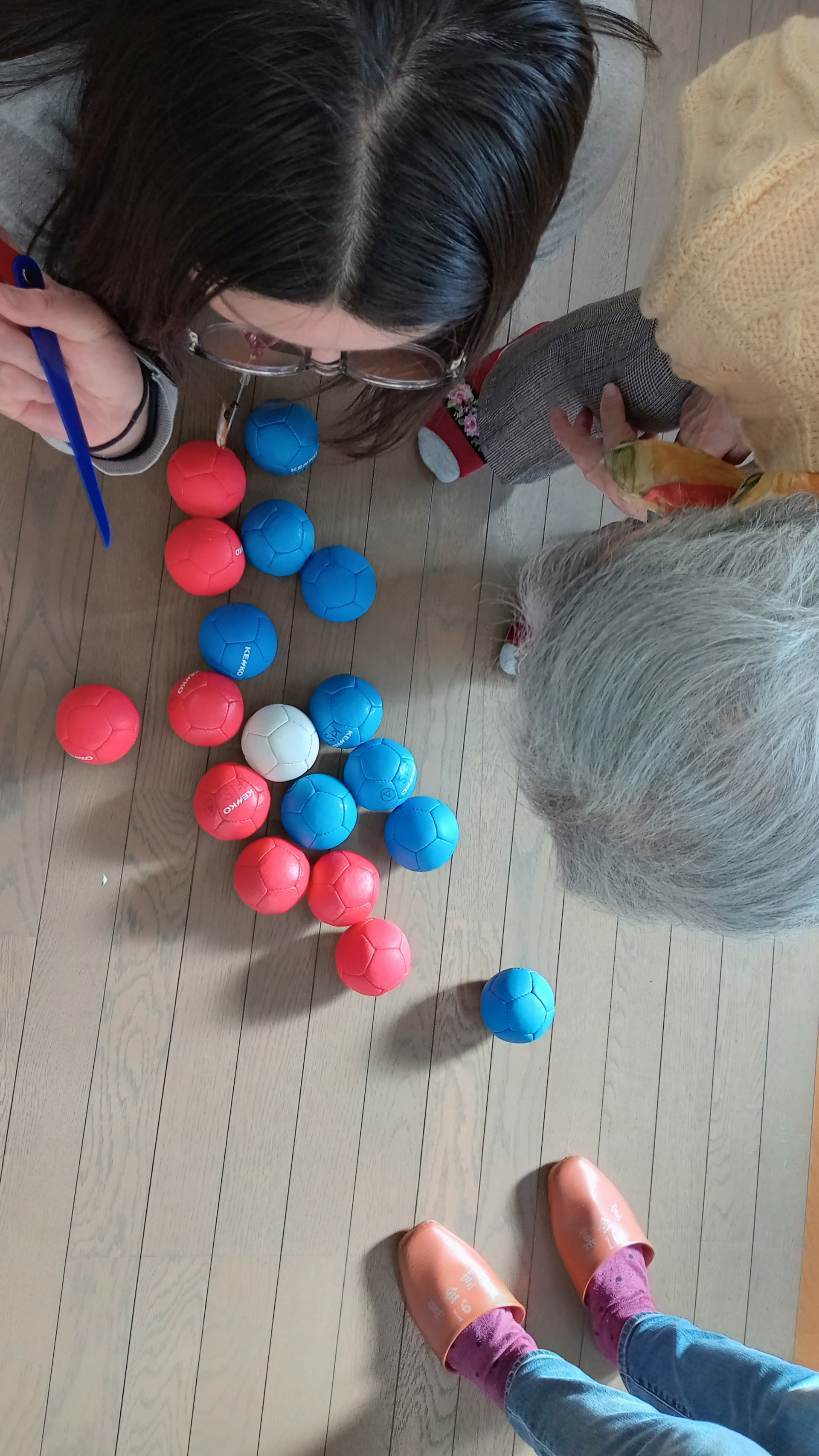 ボッチャは、白い目標球(ジャックボール)に、赤・青それぞれの持ち球を投げたり転がしたりして、