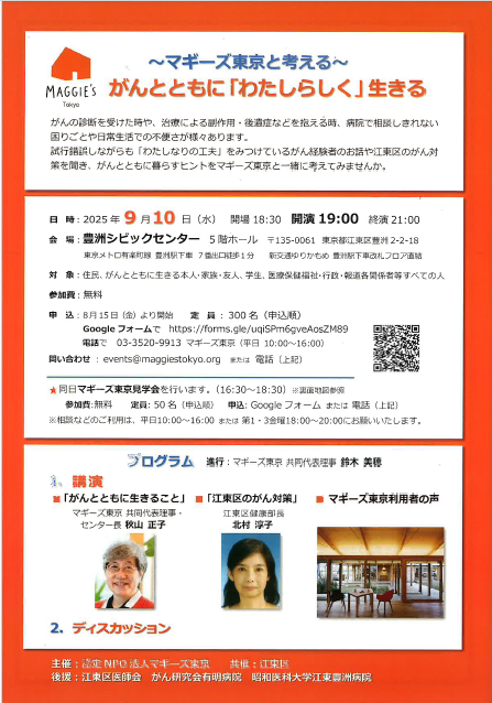 2025.08.16 【枝川包括】がんとともに暮らすヒントを考えてみませんか? お知らせ #がん #マギーズ東京 2024.09.30 【枝川包括】「がんと生きる」を考える オレンジバルーンプロジェクト 活動報告 #枝川包括 #がん #プロジェクト