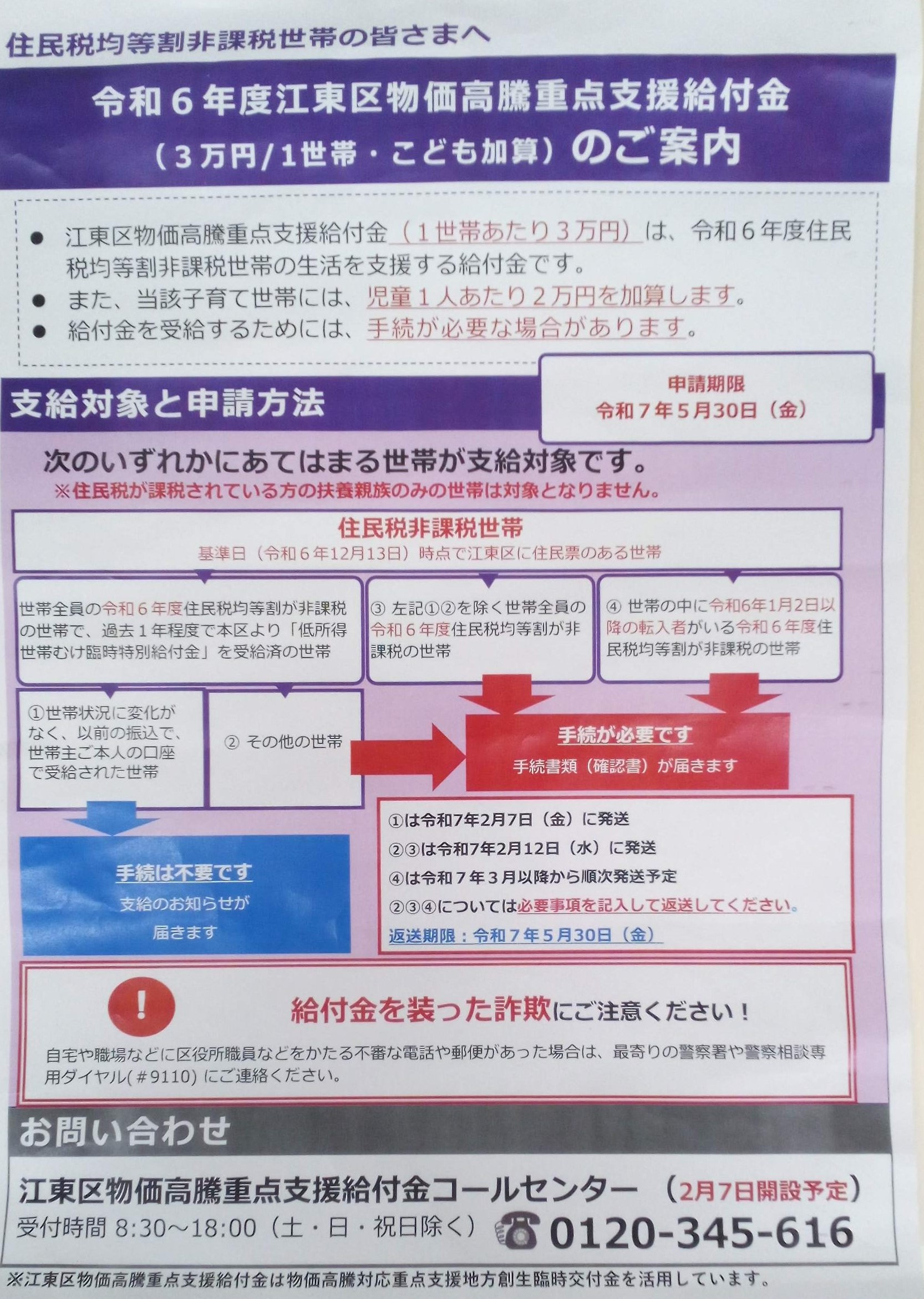 江東区より、『江東区物価高騰重点支援給付金(令和6年度住民税非課税世帯・3万円)』のご案内です。
