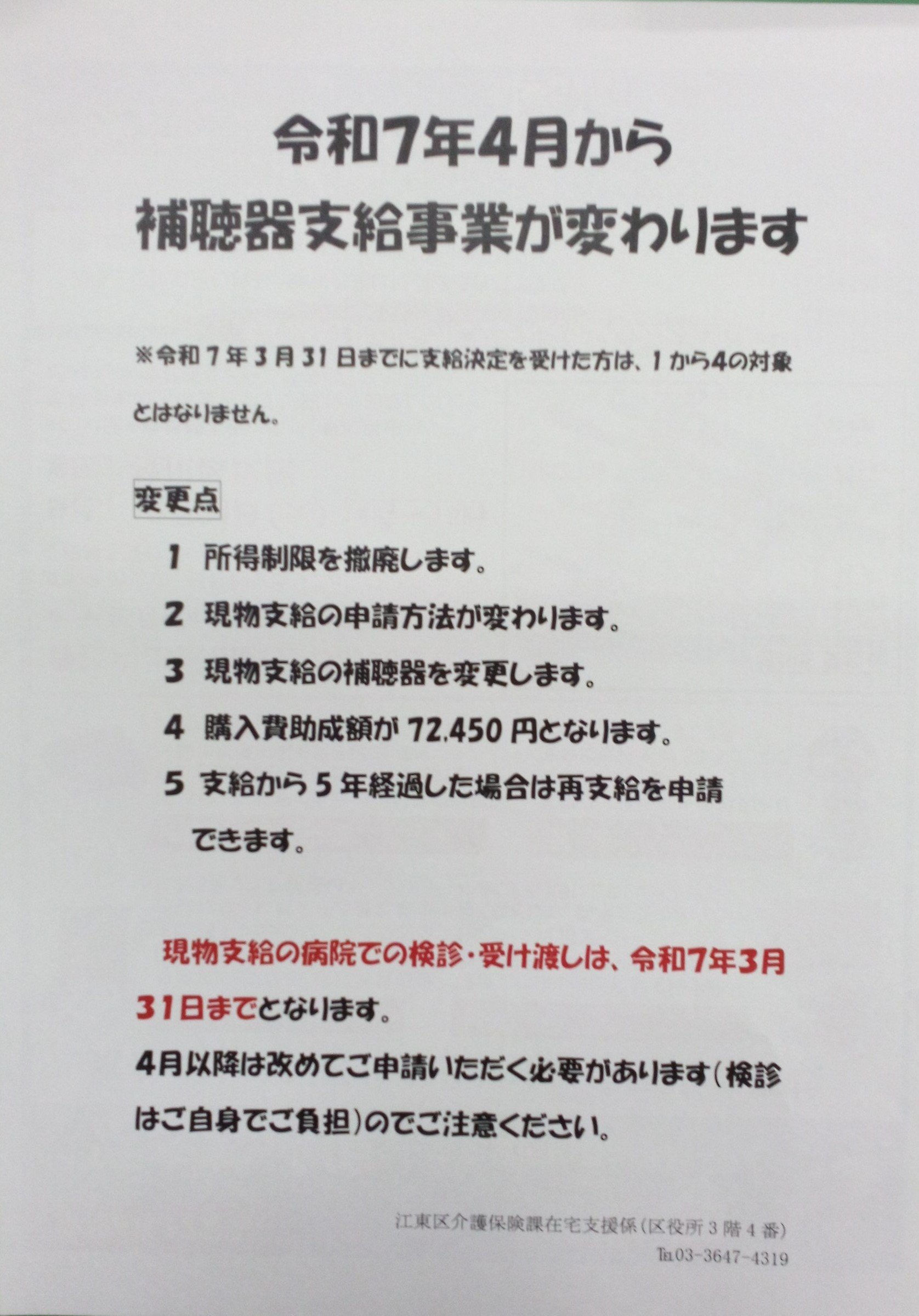 2025.02.14 ニュース 【枝川包括】令和7年4月から補聴器支給事業が変わります(江東区) Tweet シェアする 令和7年4月から、補聴器支給事業の内容が変わります。 令和7年3月31日までに支給決定を受けた方は、対象とならない点もありますのでご注意ください。(E・E) #地域包括 #補聴器 #助成 #現物支給 #枝川包括 前の記事 2025.02.15 ニュース 【枝川包括】こんな景色を見ながら訪問に向かっています 次の記事 2025.02.14 ニュース 【枝川包括】センター職員の恩師が来所され、地域福祉について意見交換をしました 一覧へ戻る