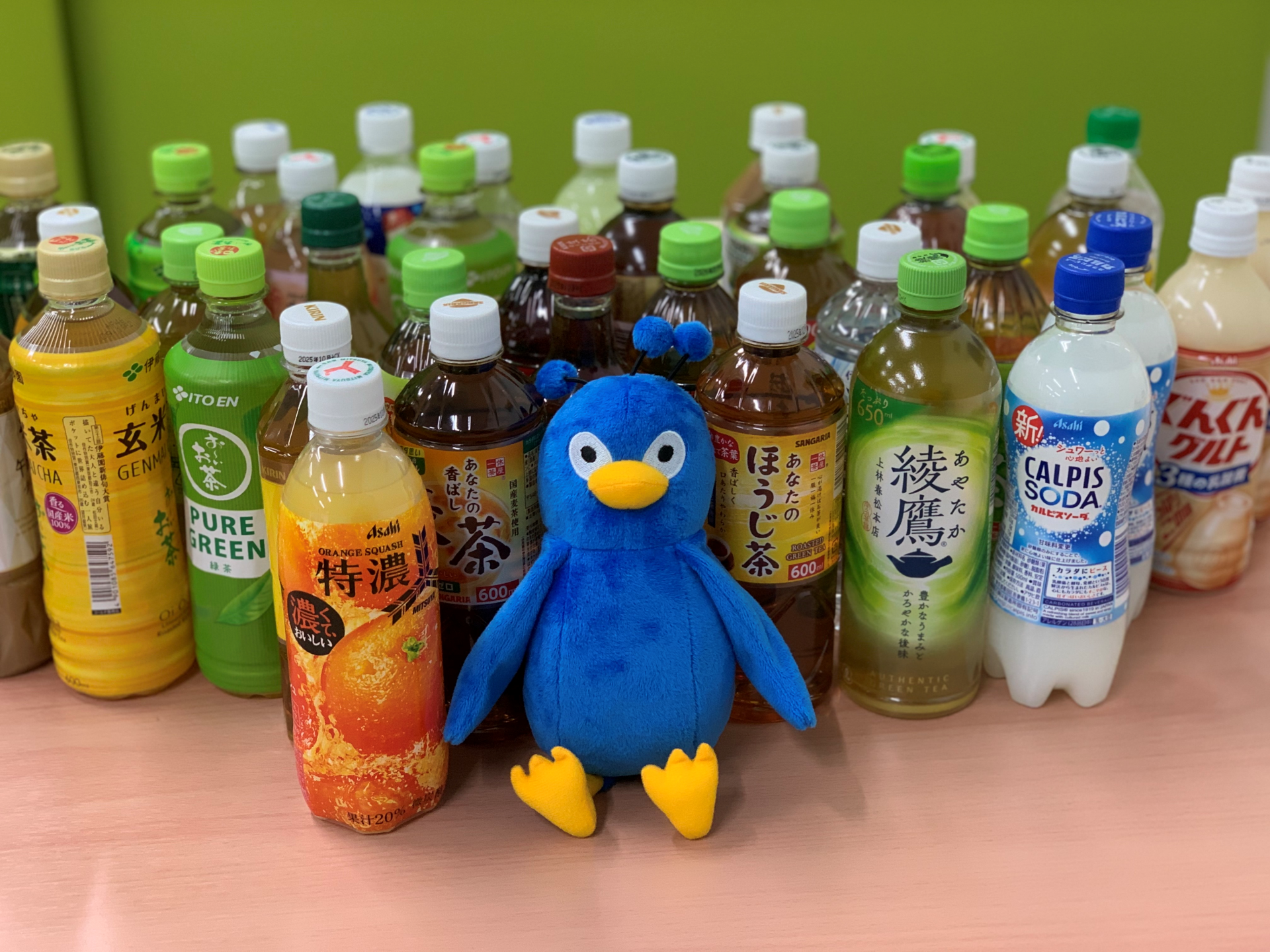 色とりどりの飲料に囲まれてくじゃぺんもご満悦です。