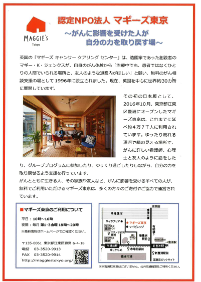 9月10日に豊洲シビックセンターで「~マギーズ東京と考える~がんとともに「わたしらしく」生きる」が開催されます。