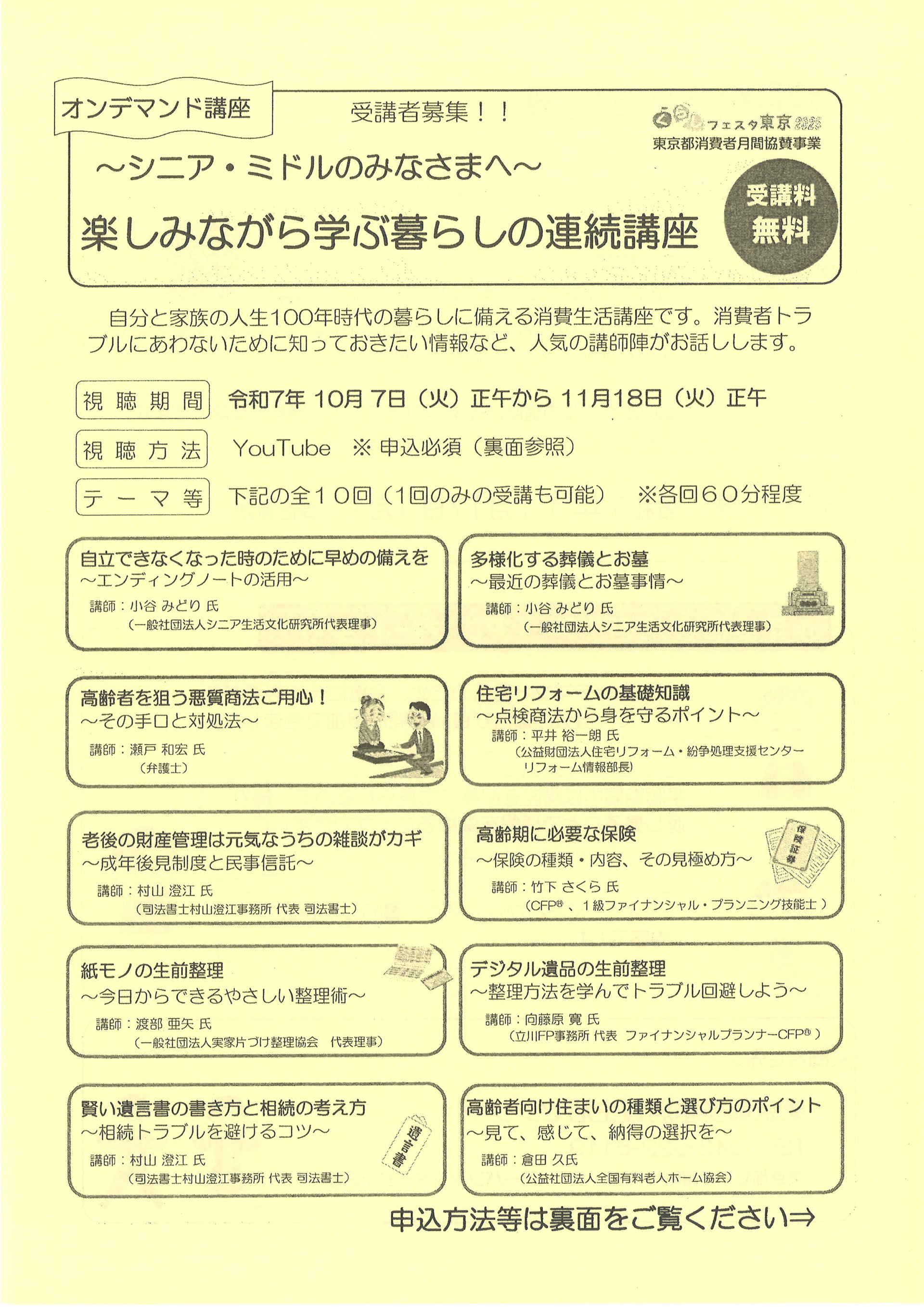 人生100年暮らしに備える消費者生活講座のご案内です。