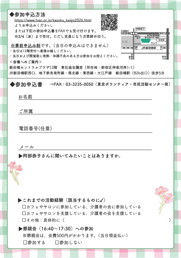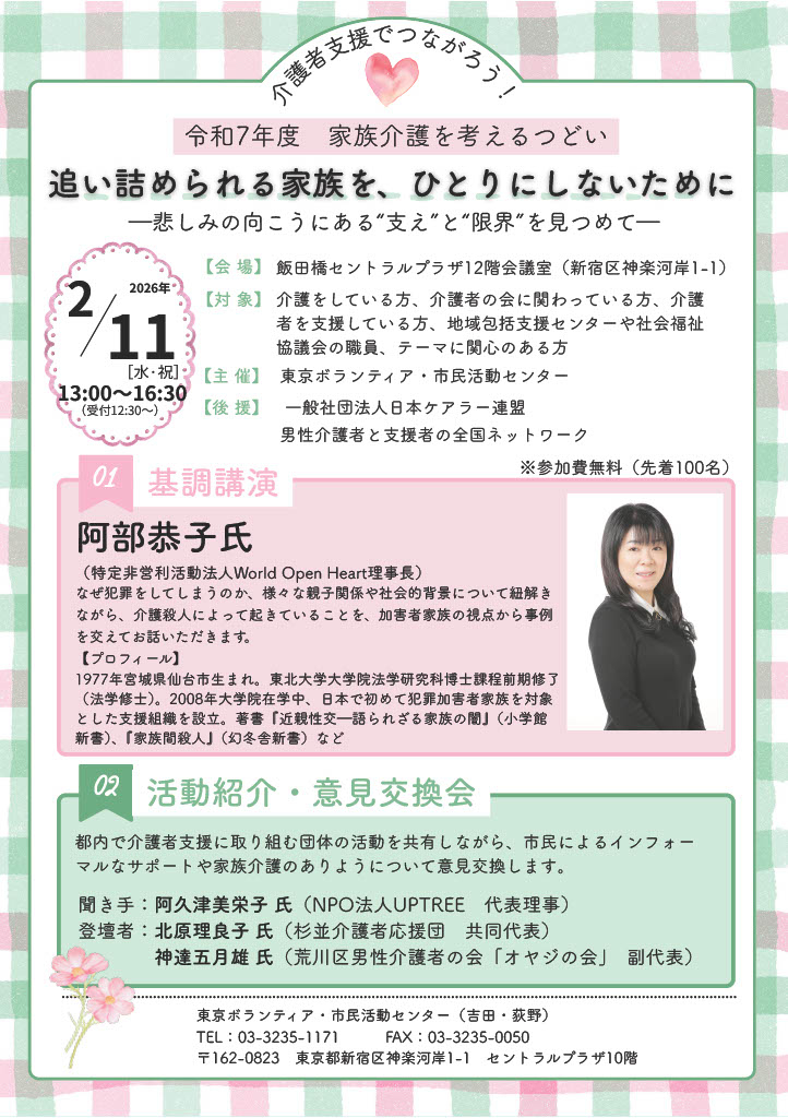 2/11(水)13:00~16:30、東京ボランティア・市民活動センターによる「家族介護を考えるつどい」が開催されます。