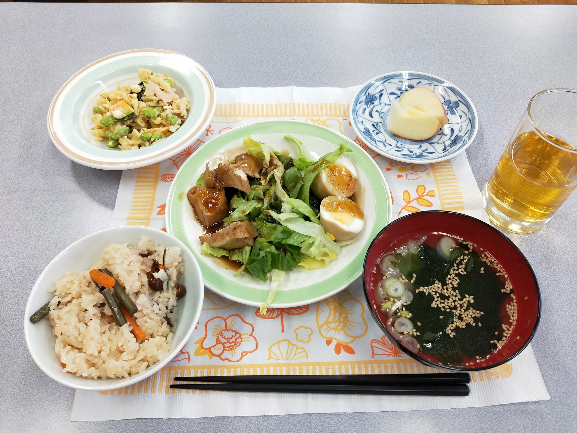 中華煮鶏・南瓜とマカロニのサラダ・山菜おこわ・わかめスープ・りんご