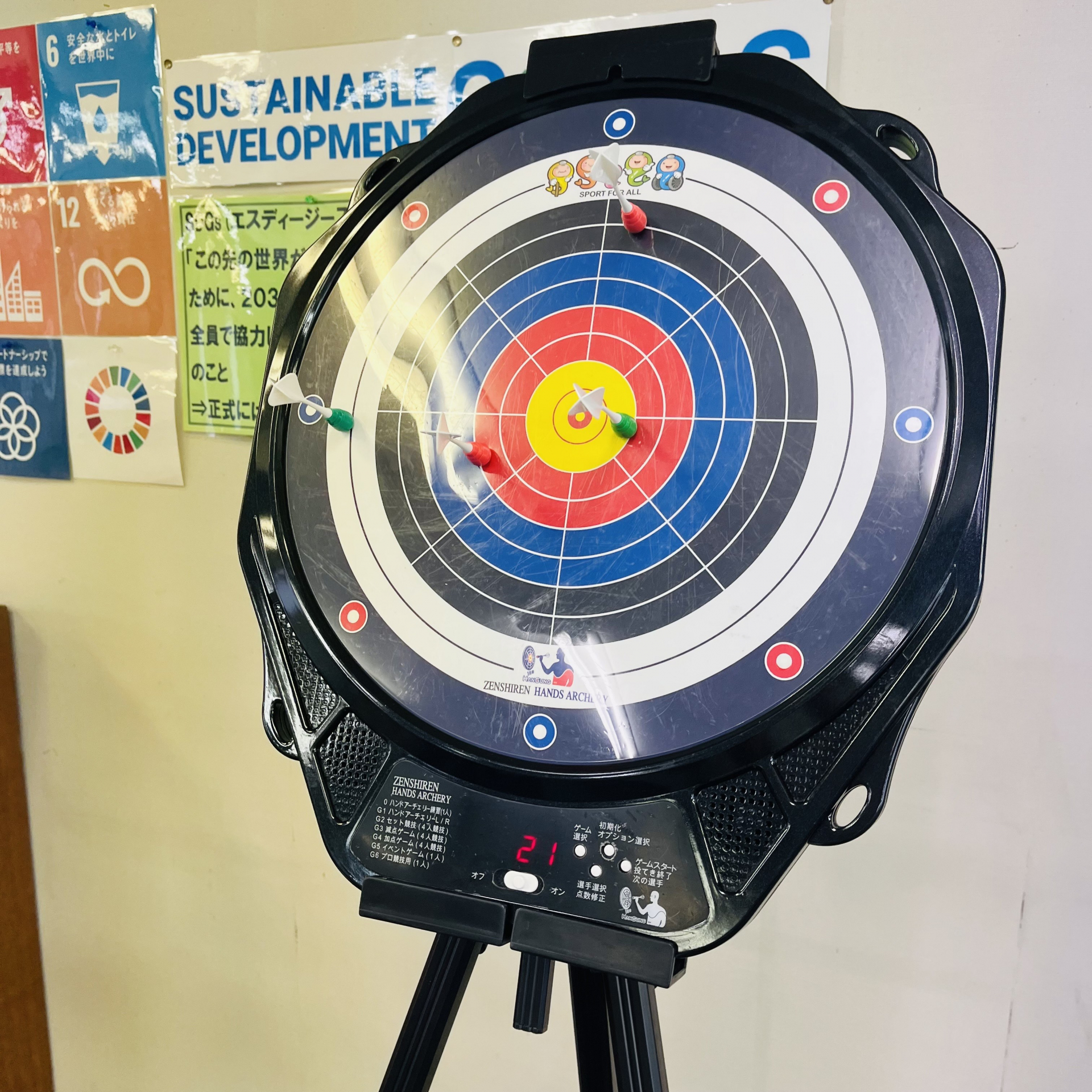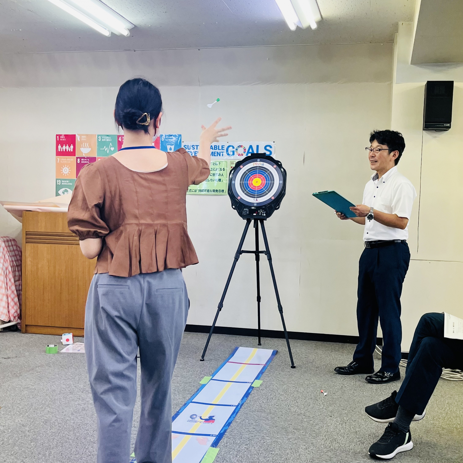 磁石でできている矢を、2M先から的に向かって投げる。中心に近いほど点数は高まります。