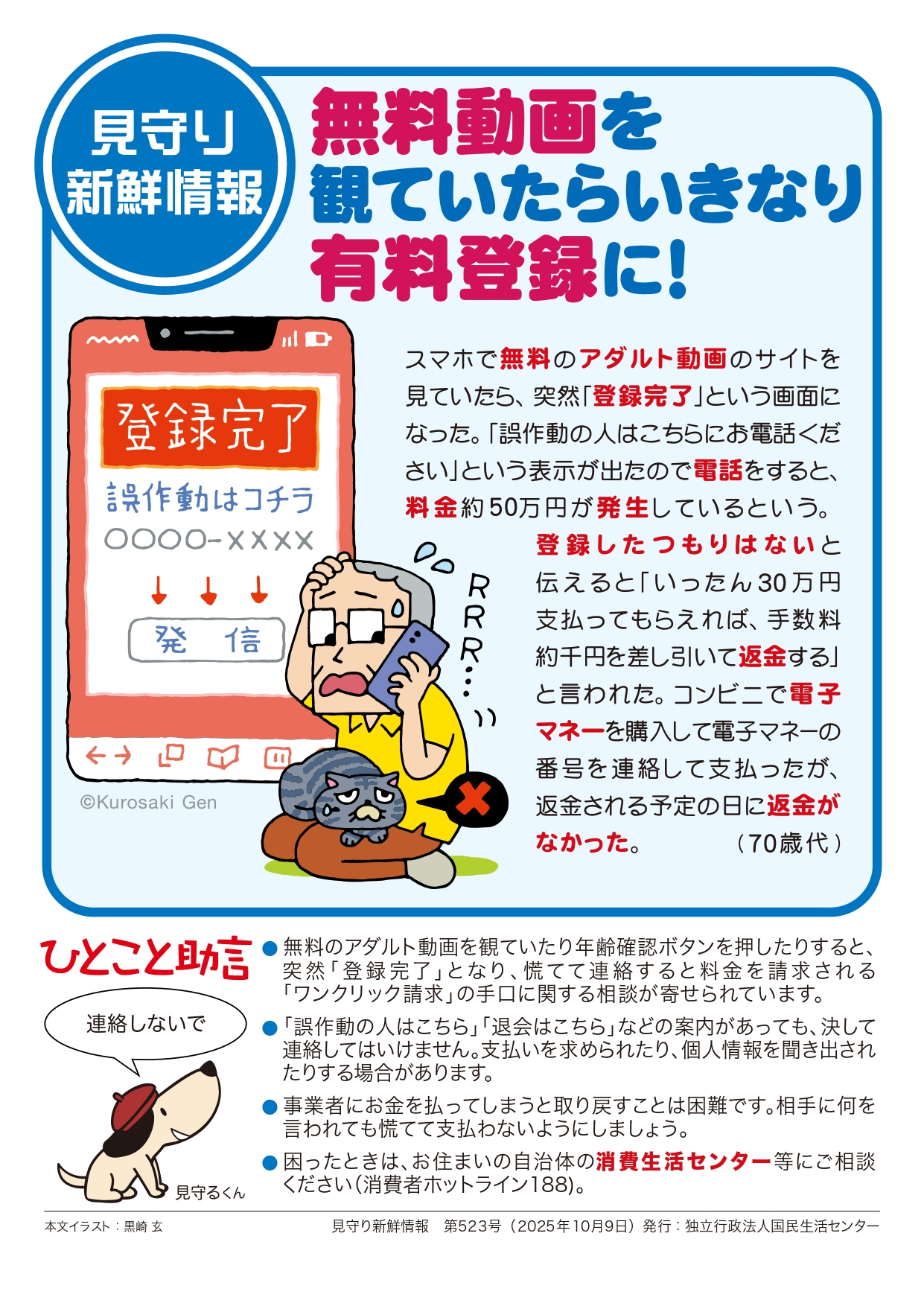 無料のアダルト動画を観ていたり年齢確認ボタンを押したりすると、突然「登録完了」となり、慌てて連絡すると料金を請求される「ワンクリック請求」の手口に関する相談が寄せられています。