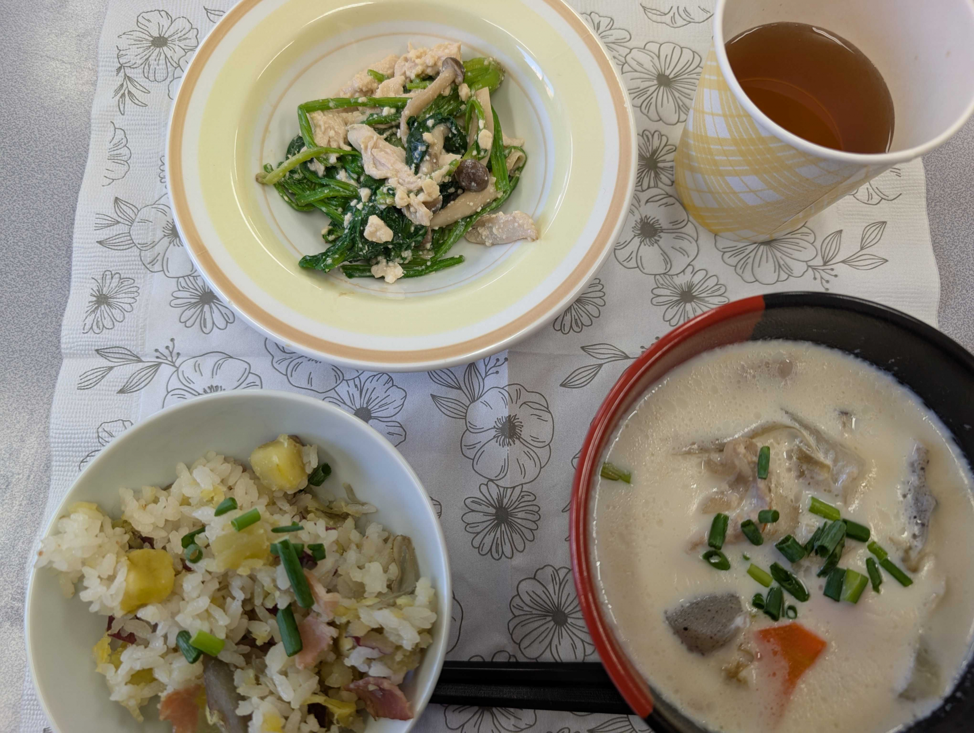 ・さつまいもとゴボウの炊き込み ・豚汁(牛乳入り)・ほうれん草と鶏ささ身のピーナッツ和え