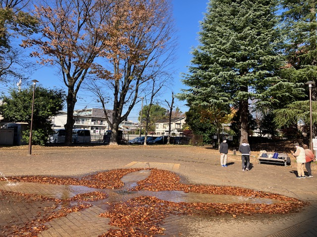 (噴水の周りの落ち葉が、素敵な模様になっていました)