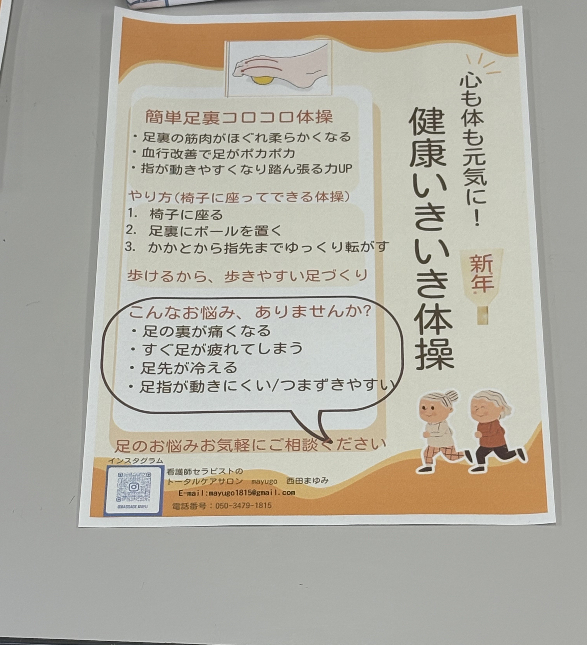 また、フットケアサロンの看護師さんがお見えになり、足の体操やマッサージ方法などを教えていただきました。
