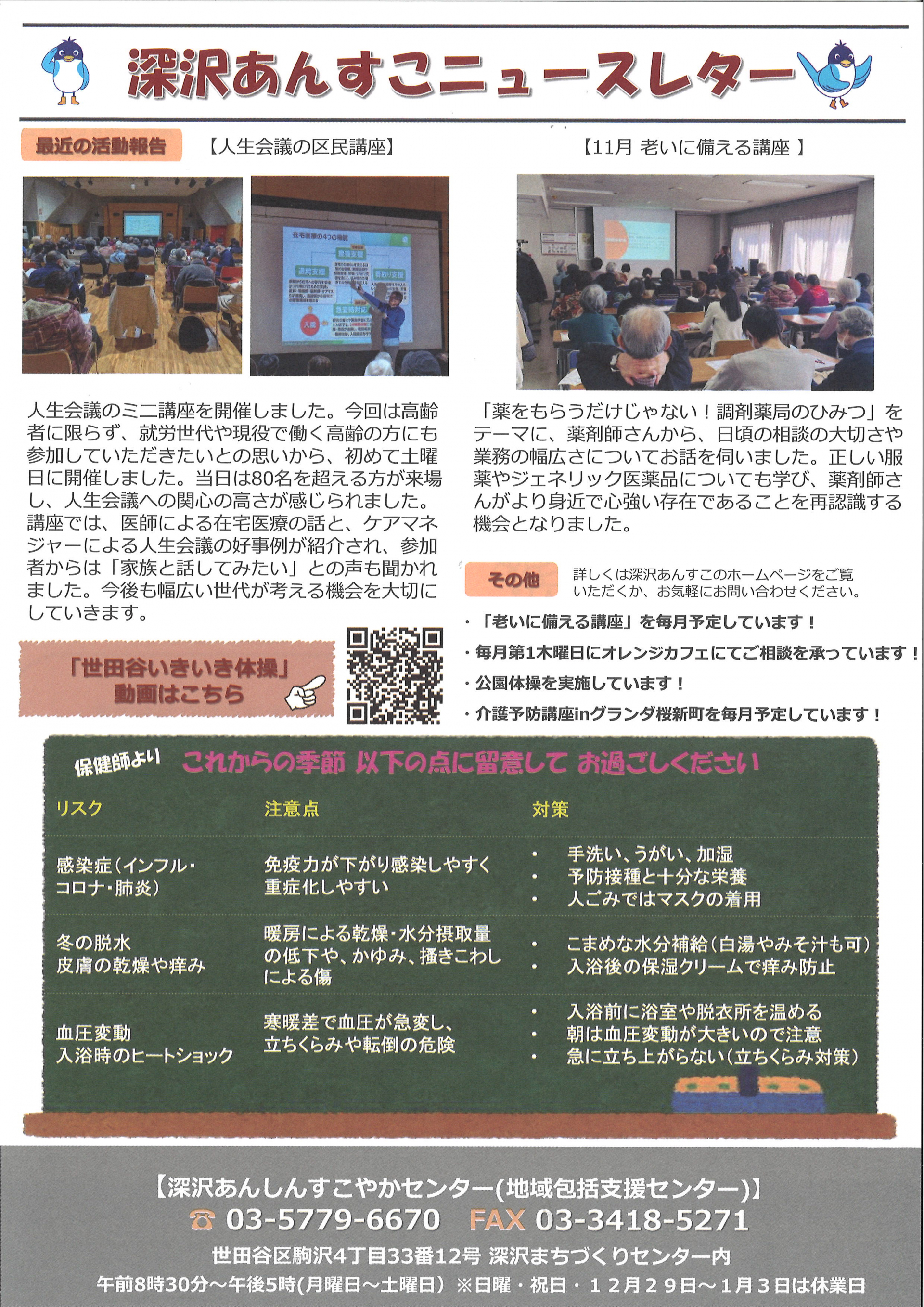 冬号の「あんすこかわらばん」を発行いたしました。冬は心身の不調や介護負担が重なりやすい季節です。