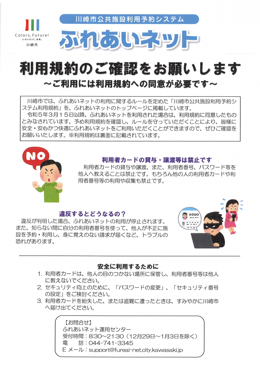2026.03.24 お知らせ 【久末居宅】ふれあいネットの利用規約のご確認をお願いします。 Tweet シェアする 川崎市公共施設利用予約システム「ふれあいネット」の利用規約のご確認をお願いします。 利用者カードの貸与・譲渡等は禁止です。【久末居宅 S】 前の記事 2026.03.24 お知らせ 【久末居宅】SOSネームプリントをご存じですか? 次の記事 2026.03.24 お知らせ 【久末居宅】自転車も交通反則通告制度開始。 一覧へ戻る