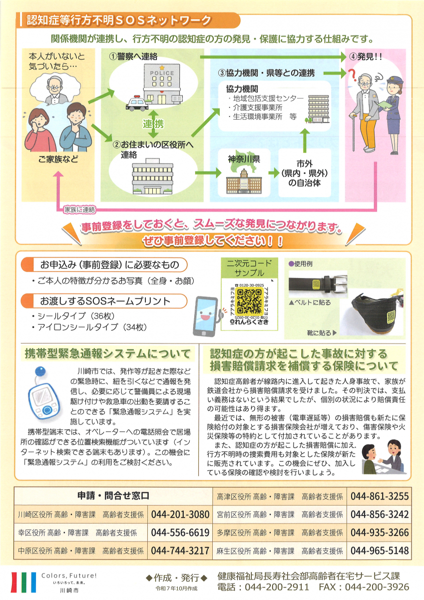 川崎市には、「認知症等行方不明SOSネットワーク」という、関係機関が連携し、行方不明の認知症の方の発見・