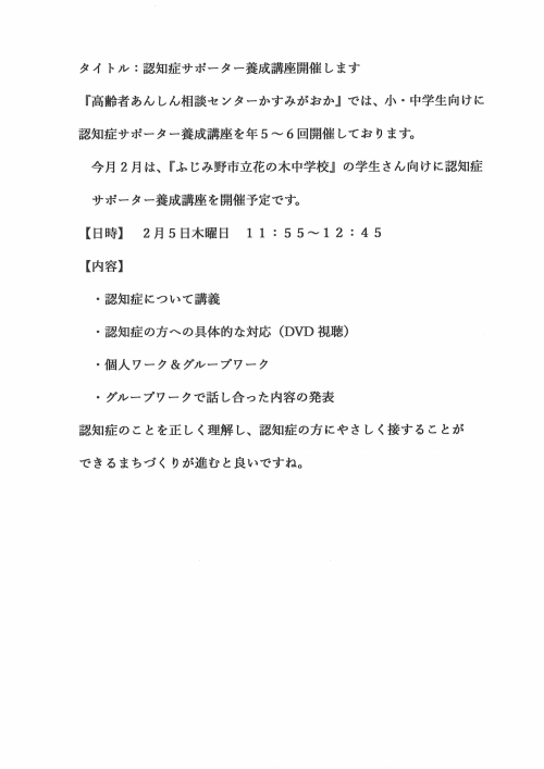 2026.02.13 【かすみがおか包括】2026年2月に恒例のりんごの会を開催いたしました。 活動報告 2026.02.04 【かすみがおか包括】令和8年第1回目の「認知症サポーター養成講座」を開催します お知らせ 2026.02.02 追加報告【かすみがおか包括】1月28日 男性自主グループ『め組』のイベント ニュース 2026.01.28 【かすみがおか包括】2月19日(木)茶話会みちくさ(当事者カフェ)を開催します お知らせ 2026.01.28 【かすみがおか包括】2026年2月13日(金)りんごの会(介護者家族の交流会)を開催いたします。 お知らせ 2026.01.28 2026年1月28日ぴんしゃん体操自主グループ『め組』さんのイベント ニュース 2026.01.28 『警察官を騙った詐欺にご注意ください』 お知らせ 2026.01.28 『介護予防フェスティバル』の御案内 お知らせ 2026.01.19 令和7年度 『認知症サポーター養成講座』 お知らせ 2026.01.17 【かすみがおか包括】2026年1月15日(木)にオレンジカフェかすみがおかを開催いたしました。 活動報告 2026.01.17 『家族介護教室』のお知らせ お知らせ 2026.01.17 『人生会議を始めよう』自分らしく尊厳ある人生にするために お知らせ 2025.12.27 【かすみがおか包括】2026年1月15日(木)年明け最初のオレンジカフェを開催いたします。 お知らせ 2025.12.20 【かすみがおか包括】2026年1月9日(金)年明け最初のりんごの会(介護者家族の交流会)を開催いたします。 お知らせ 2025.12.01 新型コロナウィルス感染症予防接種のお知らせ お知らせ 1 2 3 … 5