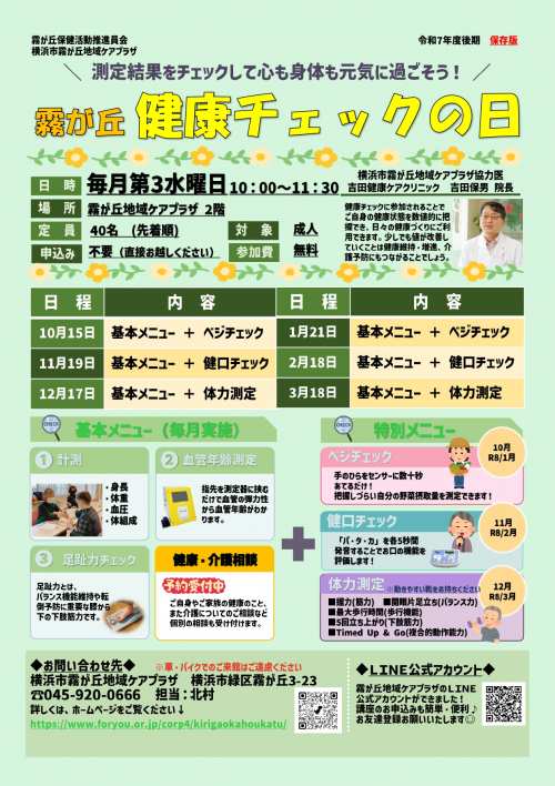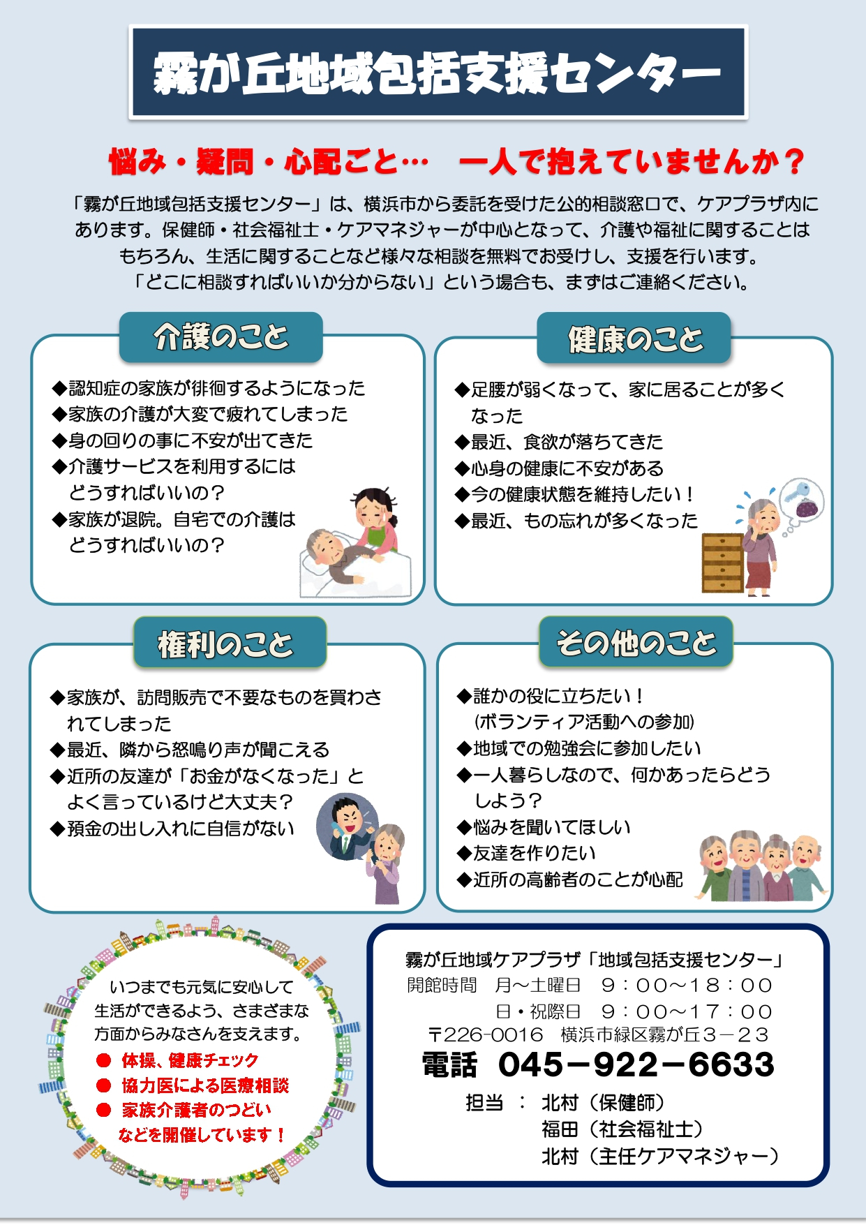 霧が丘地域ケアプラザ 地域包括支援センター kirigaokacp 社会福祉法人奉優会 地域包括支援センター事務局 社会福祉法人奉優会 包括事業部広報委員会 事業所ニュース 2025.04.01 お知らせ 【ご来館時のお願い】 2025.02.25 お知らせ 夜間の施設利用方法の変更についてのお知らせ 事業所ニュース 一覧へ 施設案内 横浜市地域ケアプラザは市民の誰もが地域において健康で安心して生活を営むことができるように、地域における福祉活動、保健活動等の振興を図るとともに、福祉サービス、保健サービス等を身近な場所で総合的に提供するために設置された施設です。 【住所】〒226-0016 横浜市緑区霧が丘3-23 【電話】ケアプラザ代表 045-920-0666 相談専用 045-922-6633 【FAX】 045-922-6611 霧の里看板 正面玄関 掲示板 相談室 動画 広報・パンフレット 2025.09.01 地域包括支援センター ご案内 PDFダウンロード 2025.03.31 【霧が丘地域ケアプラザ】介護予防支援・ケアマネジメント運営規程 PDFダウンロード 2025.03.31 【霧が丘地域ケアプラザ】介護予防支援・ケアマネジメント契約書 PDFダウンロード 2025.03.31 【霧が丘地域ケアプラザ】介護予防支援・ケアマネジメント重要事項説明書 PDFダウンロード