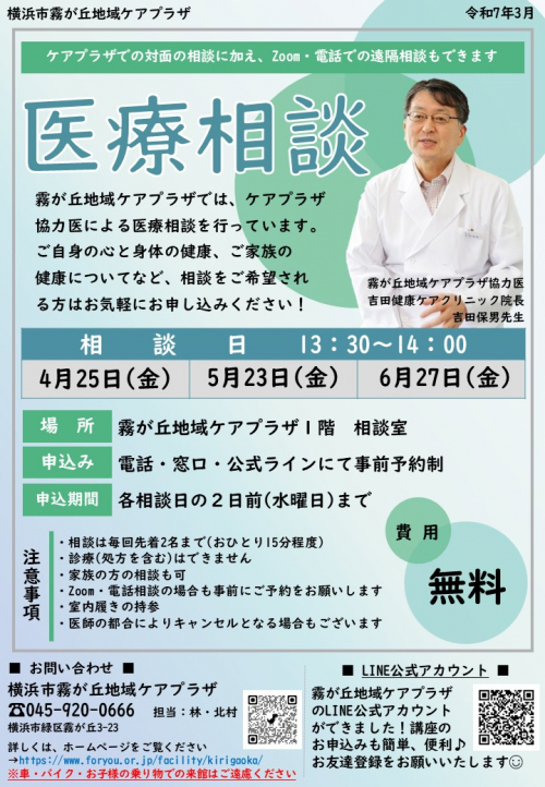 2025.08.19 【霧が丘包括】8月22日(金)は月に1回行われる『医療相談』の日 お知らせ #霧が丘 #霧が丘ケアプラザ #医療相談 2025.07.24 【霧が丘包括】医療相談のご案内 お知らせ #医療相談 2025.06.25 【霧が丘包括】医療相談のご案内 お知らせ #医療相談 2025.05.21 【霧が丘包括】医療相談のご案内 お知らせ #医療相談