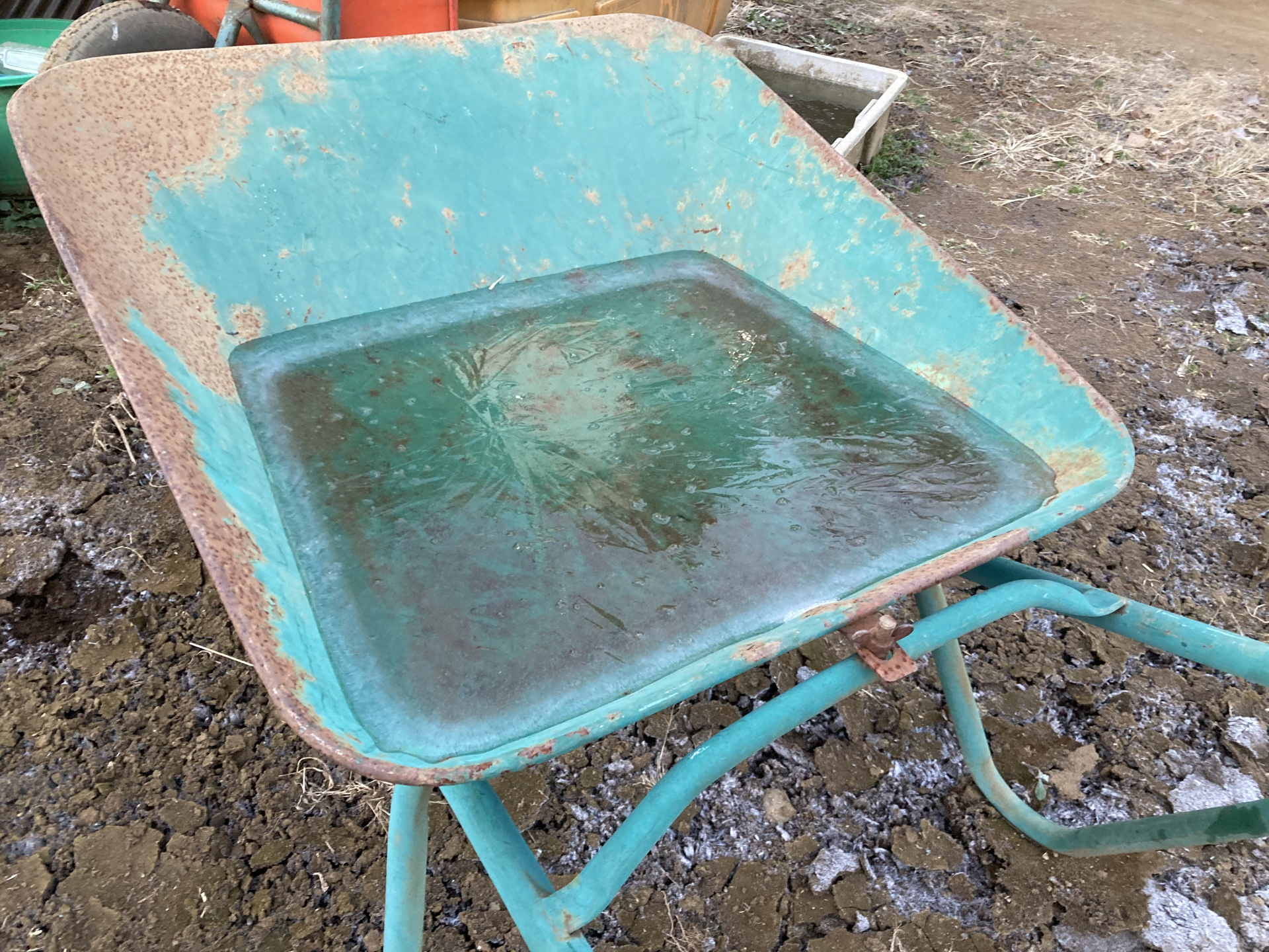それでも、先日の雨もあり一輪車の荷台にはった水が凍り