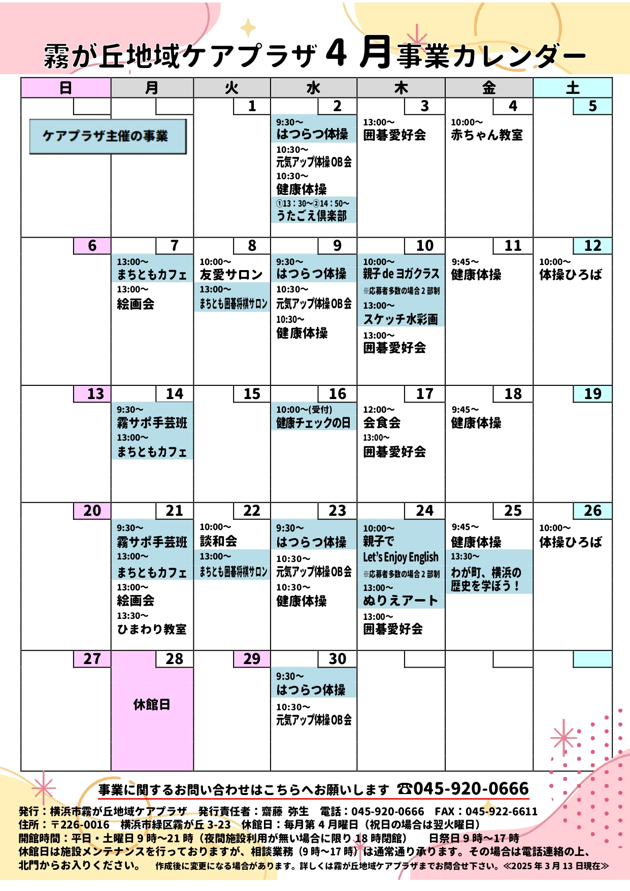 2025.03.27 お知らせ 【霧が丘包括】4月の事業カレンダーができました! Tweet シェアする 4月の事業カレンダーができました! 講座の参加にぜひご活用ください。 下記カレンダーをクリックすると画像が大きくなります。 (M.K) 前の記事 2025.03.27 お知らせ 【霧が丘包括】霧が丘包括エリア地域ケア会議を開催しました 次の記事 2025.03.26 お知らせ 【霧が丘包括】介護者のつどいを開催しました 一覧へ戻る
