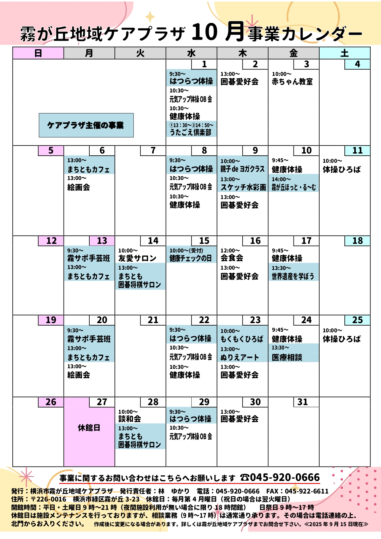 2025.09.27 お知らせ 【霧が丘包括】10月の事業カレンダーができました! Tweet シェアする 10月の霧が丘地域ケアプラザ事業カレンダーができました! 講座の参加にぜひご利用ください。 下記カレンダーをクリックすると画像が大きくなります↓ (M.K) #事業カレンダー 前の記事 2025.09.30 お知らせ 【霧が丘包括】いきいき健康塾~運動講座~開催しました。 次の記事 2025.09.27 お知らせ 【霧が丘包括】インドのお祭りが行われていました。 一覧へ戻る