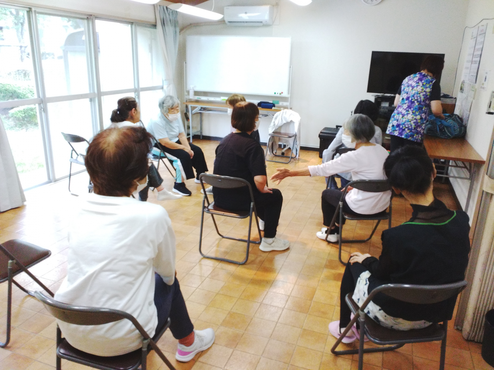 集まったメンバーの体調や身体の動きに合わせて体操のDVDを選び、自分たちのペースでゆるやかに体操したり…