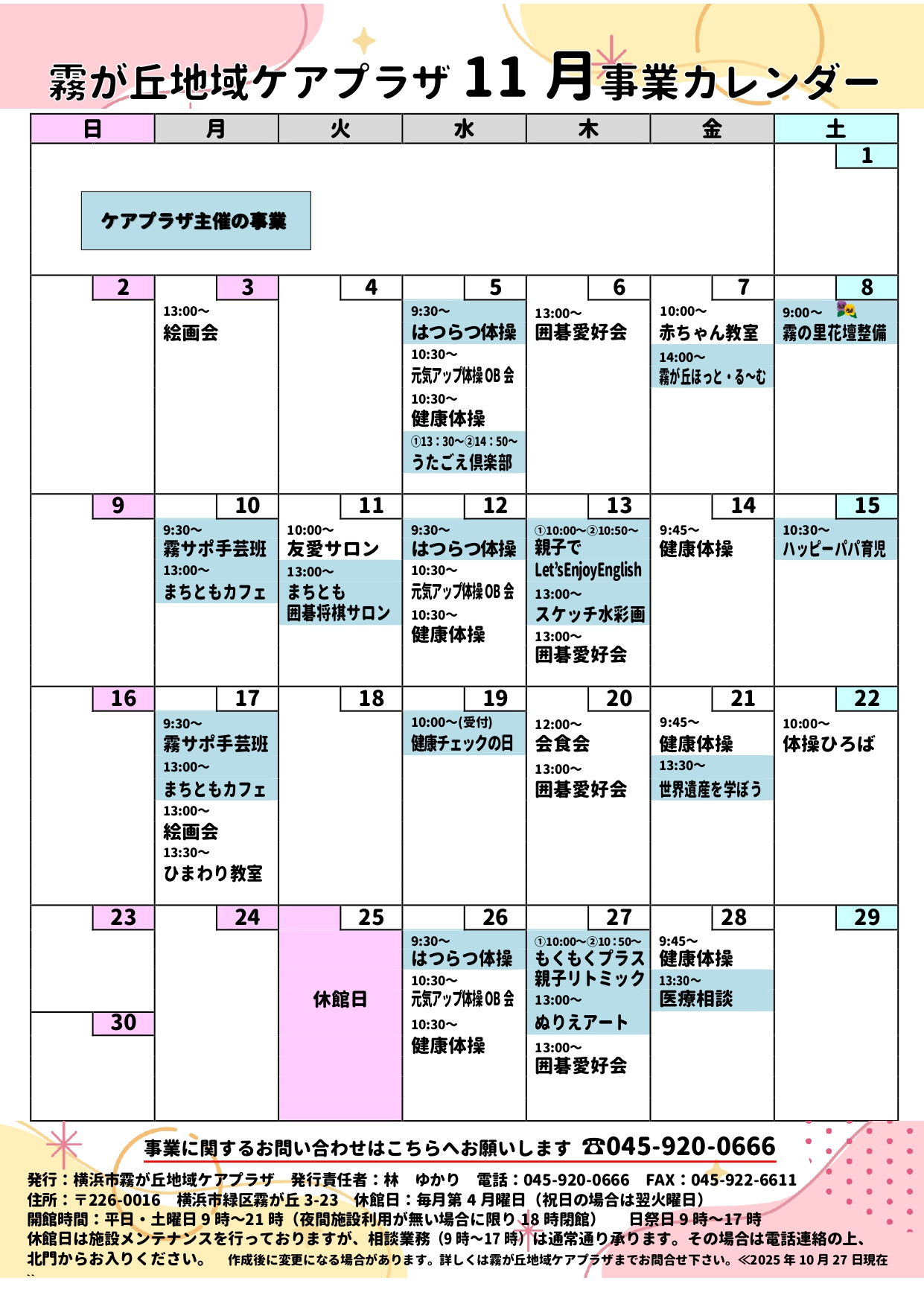 2025.10.27 お知らせ 【霧が丘包括】霧が丘地域ケアプラザ11月の事業カレンダーができました! Tweet シェアする 11月の事業カレンダーができました! 講座の参加にぜひご活用ください(*^-^*) 下記カレンダーをクリックすると画像が大きくなります↓ (M.K) #事業カレンダー 前の記事 2025.10.31 お知らせ 【霧が丘包括】成年後見制度 次の記事 2025.10.26 お知らせ 【霧が丘包括】地区別計画策定に向けて第3回検討会が開催されました。 一覧へ戻る