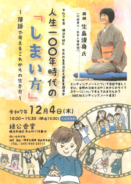 人生100年時代の「しまい方」~落語で考えるこれからの生き方~講座が、本日、緑公会堂で開催されます。