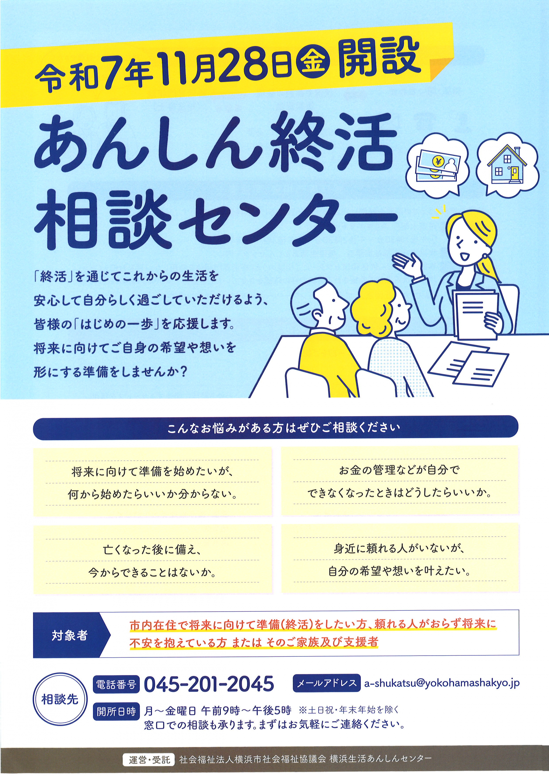 『あんしん終活相談センター』とは横浜市が令和7年11月28日に開設し、終活についての相談を受けてくれます。