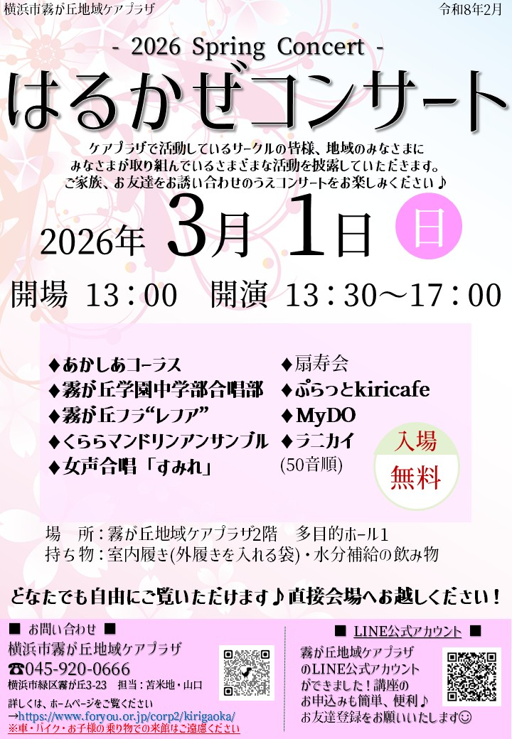 2026年3月1日(日)に『はるかぜコンサート』をケアプラザの会場で開催します♪