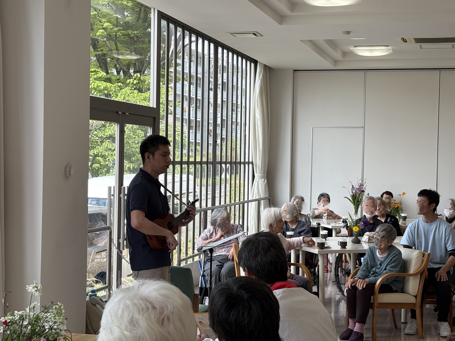 14時からはリハビリの先生と一緒に体操で体をほぐし、そのあとはウクレレのやさしい音色に合わせて、懐かしい曲を2曲みんなで歌いました。自然と笑顔が広がって、心も体もぽかぽかに。