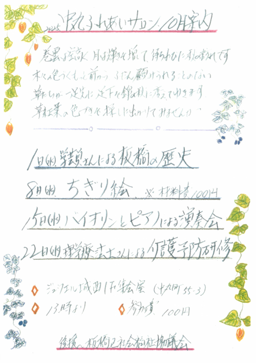 2025.11.07 NEW 【熊野包括】11月中丸ふれあいサロンのお知らせ お知らせ #中丸ふれあいサロン #ジュウエル城西 #板橋区 #介護予防 #住民主体通所型サービス #熊野おとしより相談センター 2025.08.09 【熊野包括】8月の中丸ふれあいサロンのお知らせ お知らせ #住民主体 #中丸ふれあいサロン #ジュウエル城西 2025.06.04 6月 中丸ふれあいサロンのお知らせ お知らせ #中丸ふれあいサロン #板橋区 #住民主体型通所サービス #介護予防 #ジュウエル城西 #熊野おとしより相談センター #交流 #健康講座 2025.03.05 【熊野包括】3月中丸健康サロンのお知らせ お知らせ #ジュウエル城西 #中丸健康サロン #住民主体型通所サービス #ちぎり絵 #体操 #お茶で交流 #紙芝居 #多彩な企画とお喋りで交流 2025.02.14 【熊野包括】2月中丸健康サロンのお知らせ お知らせ #中丸健康サロン #ジュウエル城西 #板橋区住民主体型通所サービス #介護予防 #おしゃべり #健康づくり #体力食停会 #熊野おとしより相談センター 2025.02.12 【熊野包括】2月中丸ふれあいサロンのお知らせ お知らせ #中丸ふれあいサロン #ジュウエル城西 #板橋区住民主体型通所サービス #介護予防 #三線演奏 #お口のフレイル予防 #熊野おとしより相談センター 2025.01.08 【熊野包括】1月中丸健康サロンのお知らせ お知らせ #板橋区 #住民主体通所型サービス #中丸健康サロン #ジュウエル城西 #体操 #小物作り #おしゃべり #熊野おとしより相談センター 2024.12.11 【熊野包括】12月中丸ふれあいサロンのお知らせです⛄ お知らせ #中丸ふれあいサロン #紙芝居 #お楽しみ会 #年忘れビンゴ大会 #ジュウエル城西 #熊野おとしより相談センター 2024.12.04 【熊野包括】12月中丸健康サロンのお知らせです お知らせ #中丸健康サロン #ジュウエル城西 #住民主体型通所サービス #クリスマス演奏会 #介護予防 #熊野おとしより相談センター 2024.10.09 【熊野包括】10月中丸ふれあいサロンのお知らせです お知らせ #中丸ふれあいサロン #ジュウエル城西 #住民主体型通所サービス #介護予防 #栄養バランスの整え方 #運動指導員による体操 #熊野おとしより相談センター #板橋区 2024.10.02 【熊野包括】10月中丸健康サロンのお知らせ お知らせ #板橋区 #介護予防 #住民主体型通所サービス #中丸健康サロン #ジュウエル城西 #熊野おとしより相談センター #元気になりたい #フルートの演奏 #理学療法士によるフレイル予防 2024.09.07 【熊野包括】9月中丸ふれあいサロンのお知らせです お知らせ #板橋区 #熊野おとしより相談センター #住民主体型通所サービス #介護予防 #中丸ふれあいサロン #ジュウエル城西 #南京玉すだれ 2024.09.03 【熊野包括】9月中丸健康サロンのお知らせです お知らせ #中丸健康サロン #住民主体型通所サービス #介護予防 #ジュウエル城西 #熊野おとしより相談センター 2024.08.06 【熊野包括】8月中丸健康サロンのお知らせ お知らせ #板橋区 #介護予防 #住民主体型通所サービス #ジュウエル城西 #中丸健康サロン #熊野おとしより相談センター 2024.07.27 【熊野包括】カレーイベント開催🍛 お知らせ #みんなで楽しいカレーランチはいかが!! #ジュウエル城西 #中丸健康サロン #中丸ふれあいサロン #板橋区 #介護予防